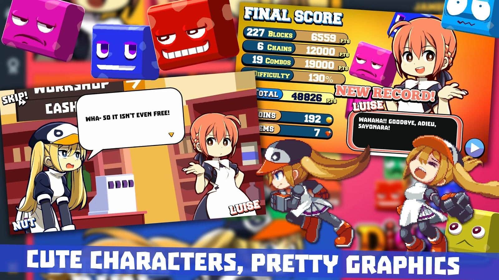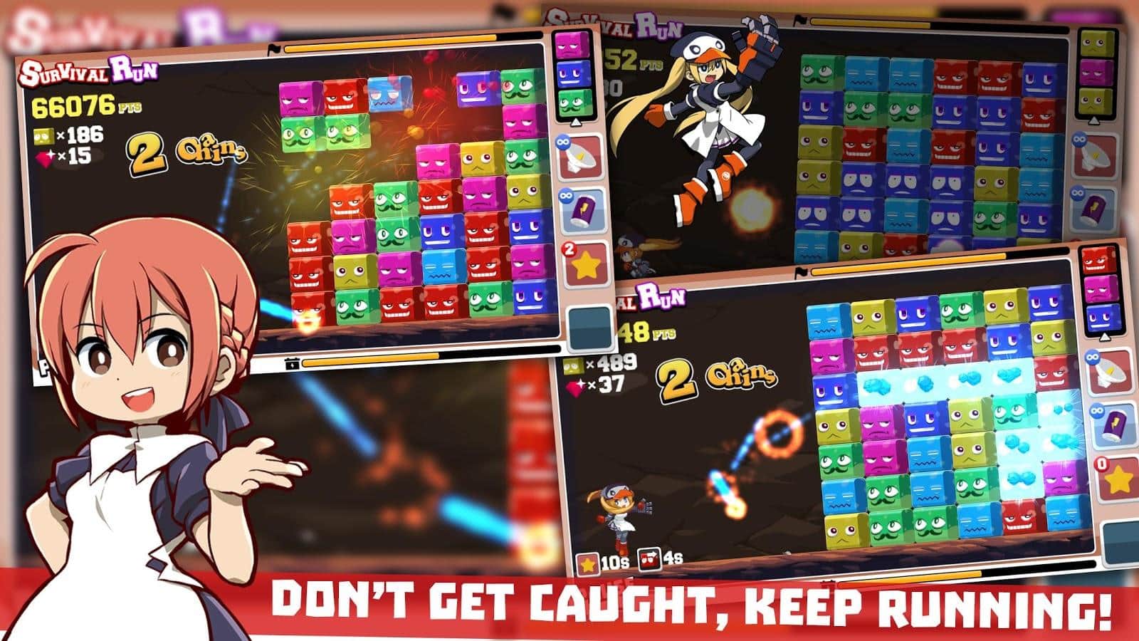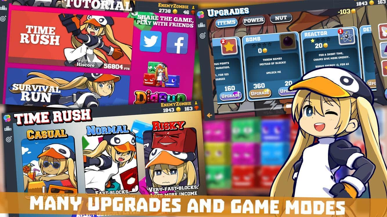 DigRun – игра головоломка на андроид, в которой вам предстоит собирать кубики в ряд и убирать их с поля. В этой игре вы будете помогать маленькой девочке, собирать разноцветные кубики и наносить удары по ним с помощью специальных бонусов. Убирая с поля достаточное количество блоков, вы сможете активировать могущественные способности, которые помогут вам быстрее разрушать блоки. В игре присутствуют шесть цветов кубиков каждый из них обладает различной мощностью, разбивая их вы освобождаете всю мощь. Играйте вместе с симпатичными персонажами и наслаждайтесь яркой графикой и анимированными кубиками.