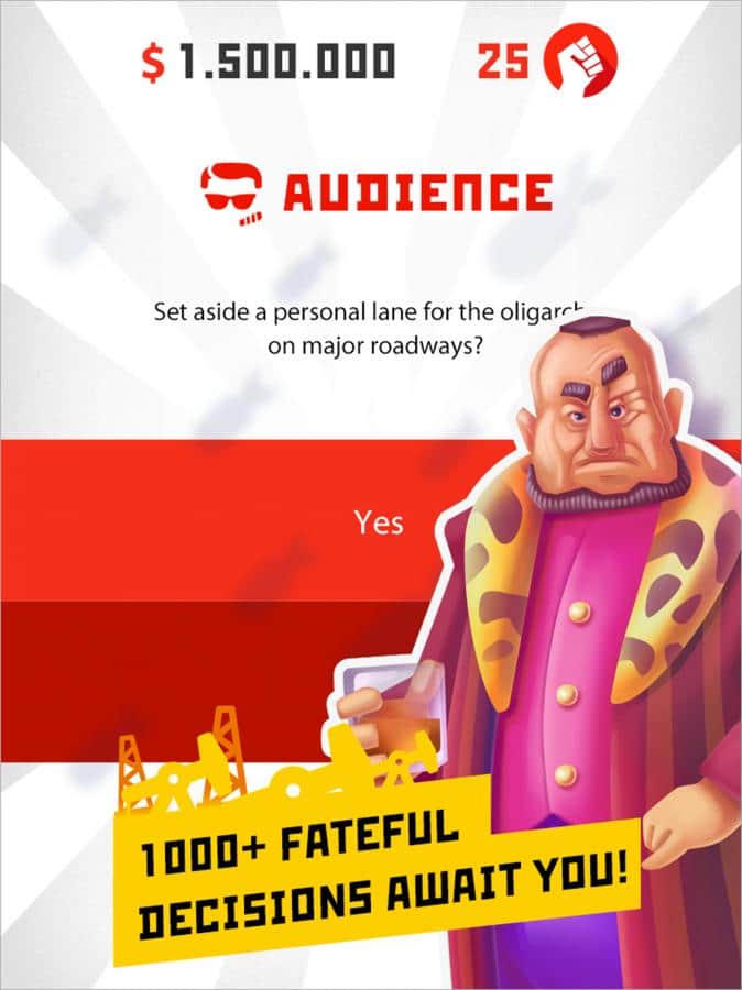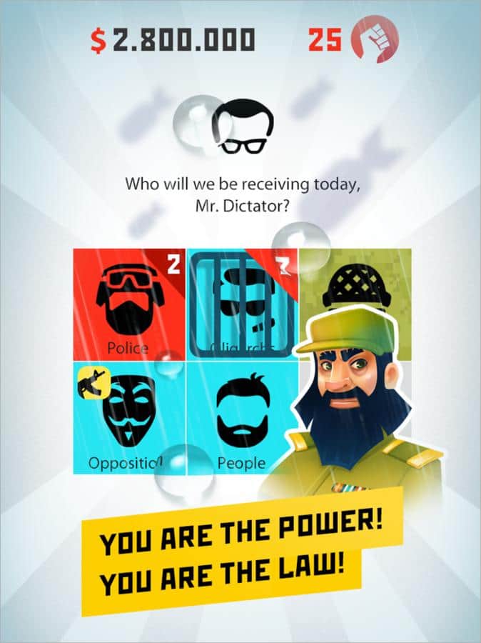 Диктатор: Революция - игра считается одной из лучших стратегий на IOS в таких странах как: России, США, Германии, Англии, Австралии, Канаде, Франции и других. Если вы давно мечтали о власти, тогда эта игра специально для вас. В результате заранее подготовленного и вероломного переворота вы свергли существующую власть, а сами стали единолично править небольшой страной. Вы когда нибудь ощущали безграничную власть? Я думаю это чувство понравится любому и з нас. В игре ваши «рабы» разделены на шесть подвидов: армия, полиция, олигархи, правозащитники, народ и ваша семья и родственники. Игра пошаговая и за каждый ход к вам приходит один из представителей фракции, естественно чего ни будь попросить. Сможете вы держать держать хрупкий баланс между распределением вашего внимания по фракциям?