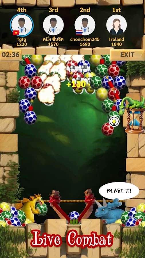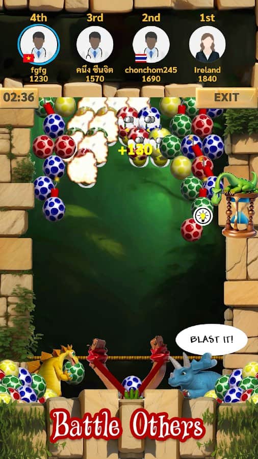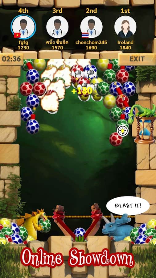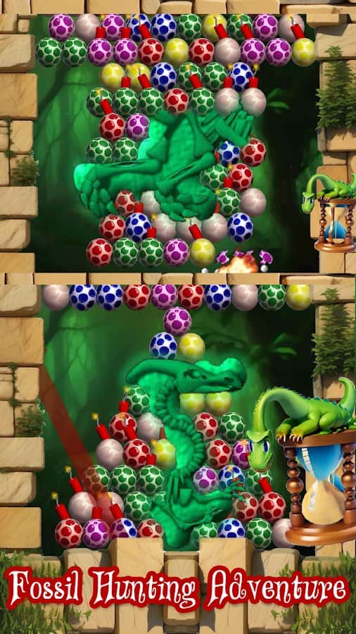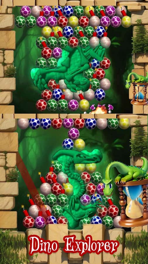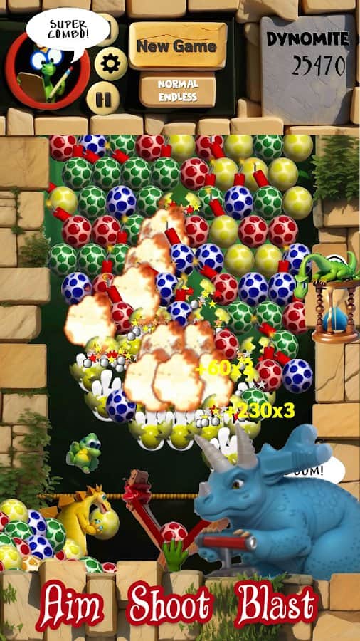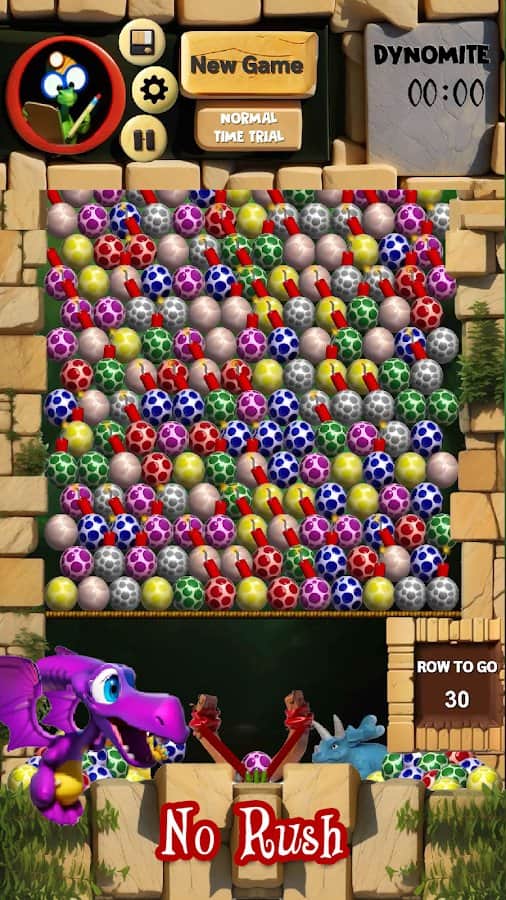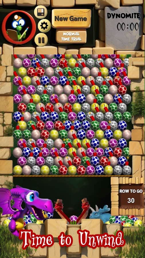 Dino Eggs - 2 друга динозавра решили взорвать яйца, которые всё время преследуют их, куда бы они не пошли. Мы поможем им в этом деле здесь и сейчас. Оттягивая рогатку с яйцом внутри, мы должны попасть в яйца одного цвета и набрать таким образом больше 3 яиц в ряд. Но также есть яйца со взрывчаткой внутри: когда мы кидвем в них яйцо их цвета, то всё взрывается. В игре есть несколько различных режимов, которые помогут разбавить однообразие: режим на время, пазл, а также мультиплеер, где мы должны выиграть соперников по очкам.