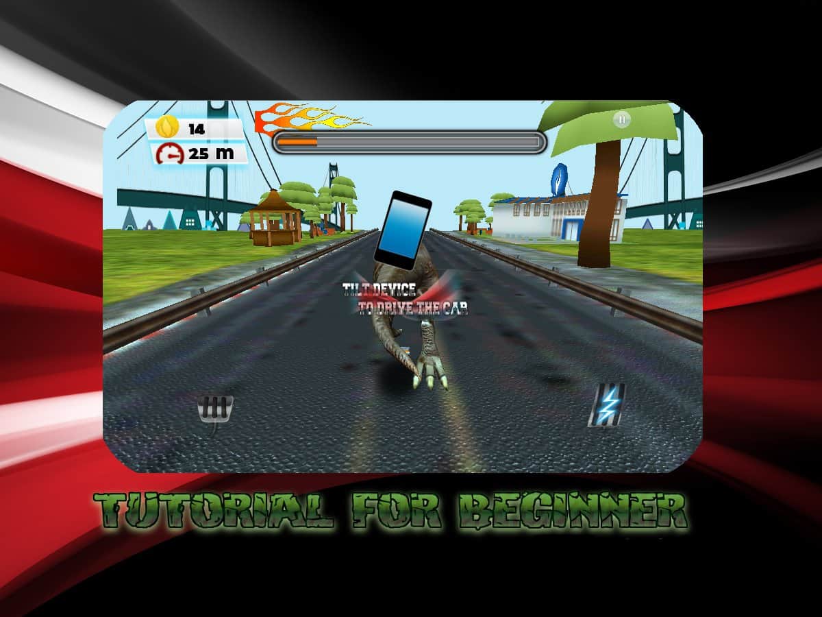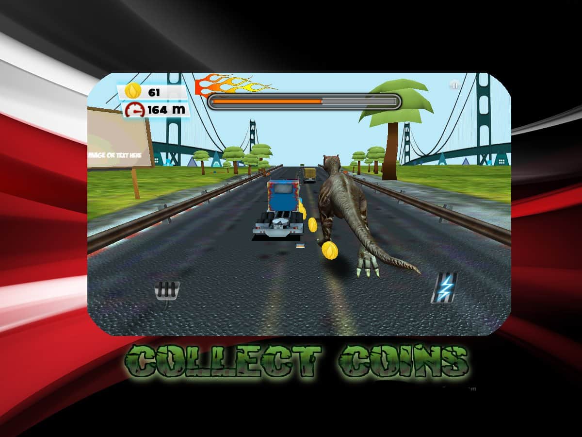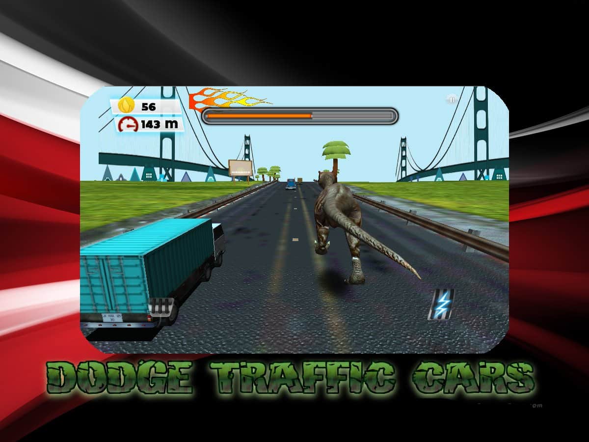 Dinosaur Run – раннер на андроид, в котором вам предстоит управлять динозавром бегающим по городским улицам. Каким-то невиданным образом настоящий доисторический динозавр попал в наше время и бегает по оживленным трассам, вашей задачей будет управлять этой огромной рептилией с помощью наклонов телефона и маневрировать сквозь бесконечный трафик. Бегайте по оживленным трассам и старайтесь, чтобы динозавр не раздавил проезжающие мимо машины и при этом собирал большое количество золотых монет. Играйте в эту игру и получайте максимум удовольствия от хорошей графики и занимайте первые места в таблице лидеров.
