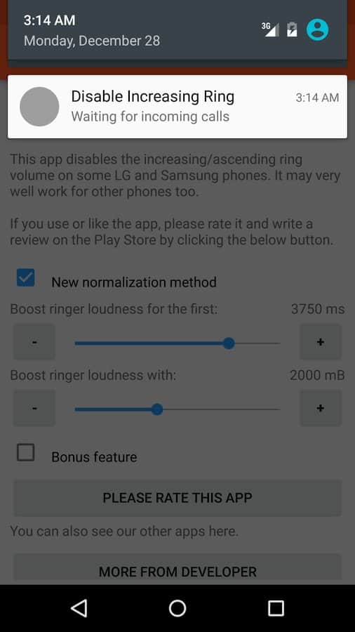 Disable Increasing Ring – хорошее приложение на андроид для тех, кому неудобен и надоел нарастающий звонок телефона, а именно Samsung, LG и прочих устройств. Данная программа отключит подобную функцию звонка.