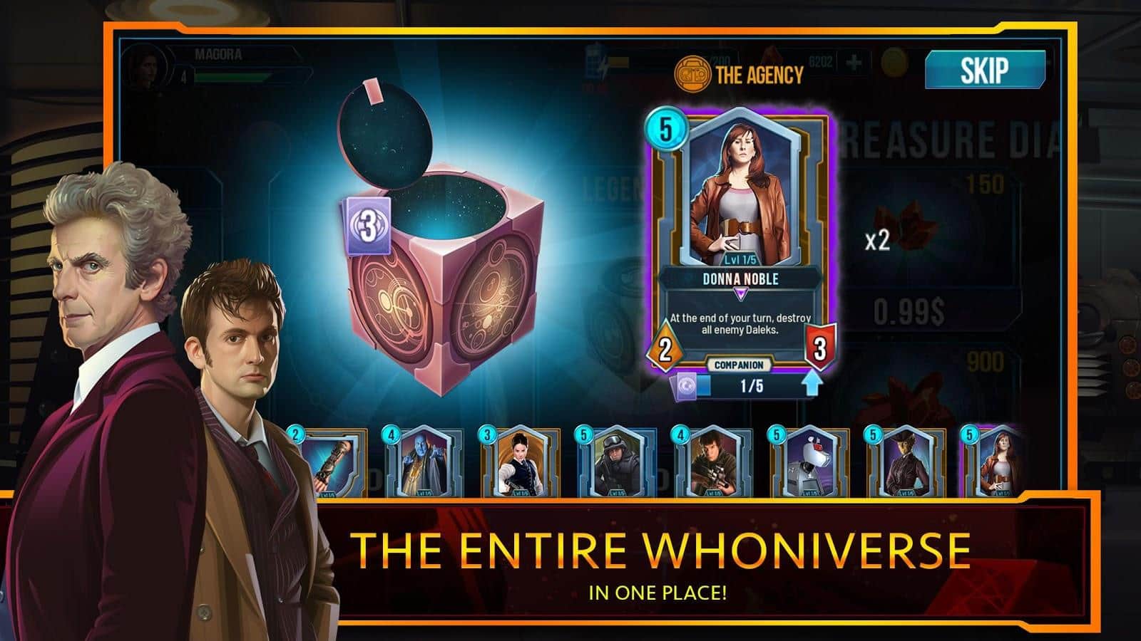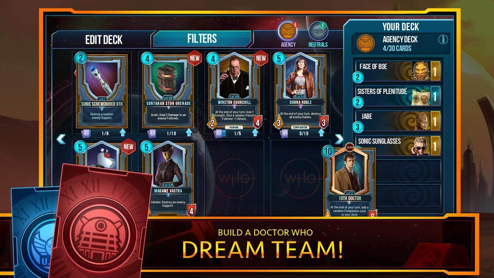 Doctor Who: Battle of Time - новая карточная стратегия от знаменитого разработчика студии BANDAI NAMCO, известной благодаря целому ряду аркад. В основу сюжетной линии Doctor Who: Battle of Time легла легендарная история культового научно - популярного сериала про Доктора Кто. В остальном данный проект это классическая настольная игра в которой вы сможете окунуться в атмосферу мистики, науки и космических исследований. Замысловатая история отлично передана не только благодаря оригинальным решениям, но и приятной рисованной графике.