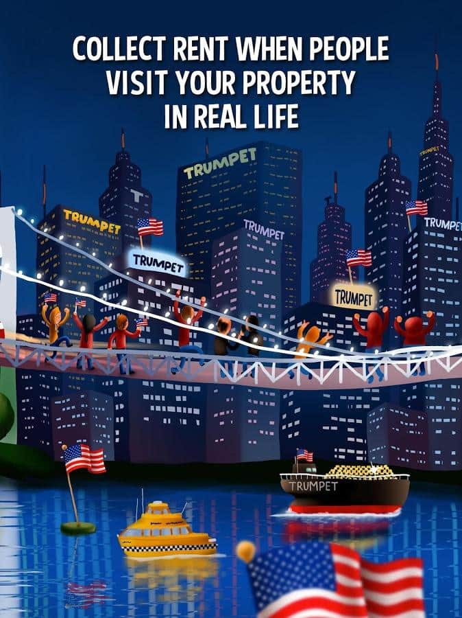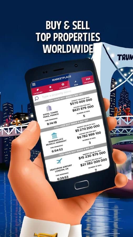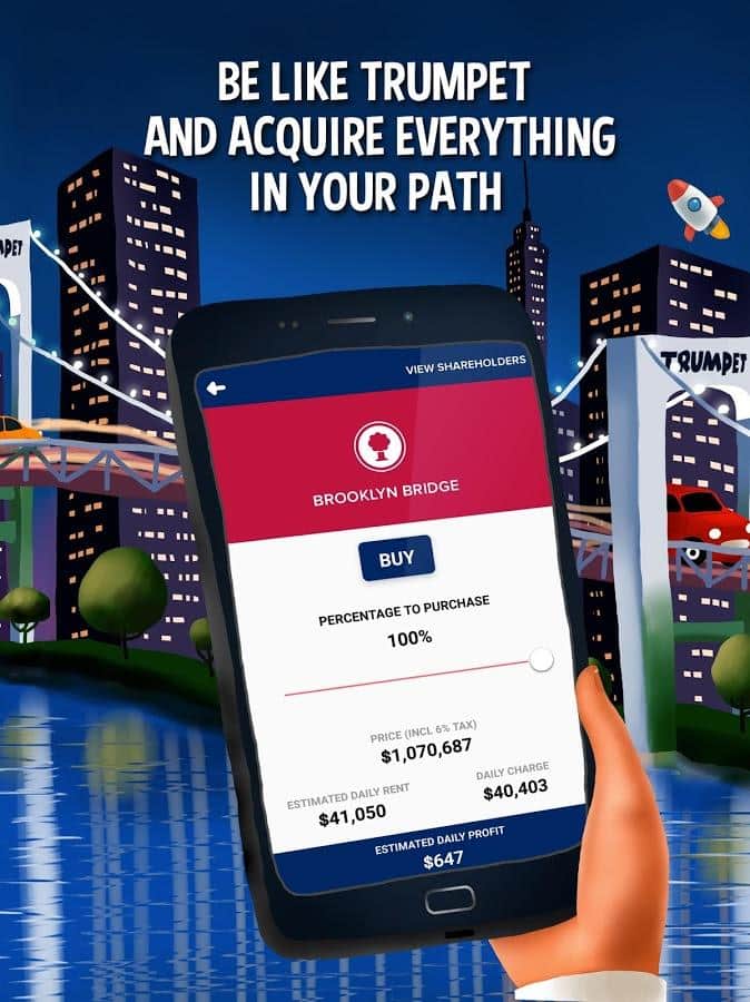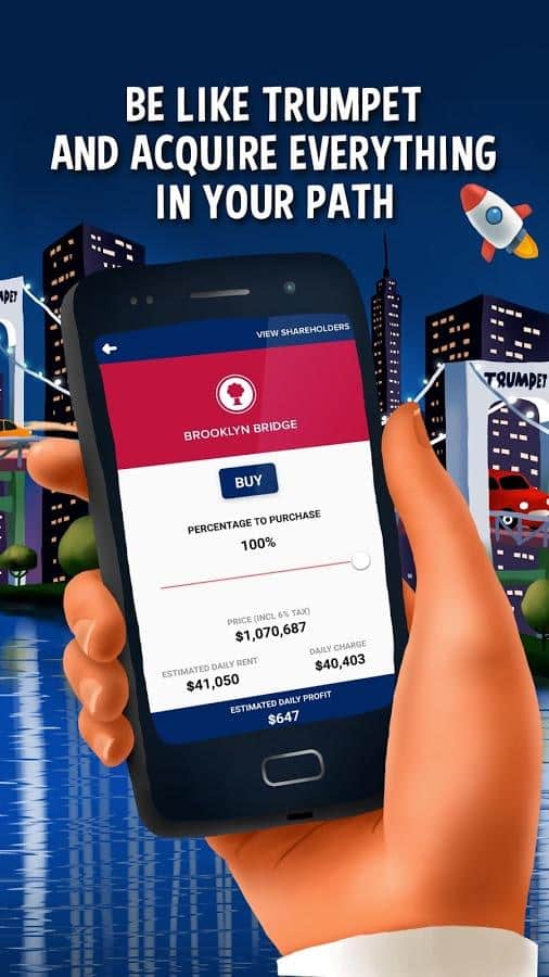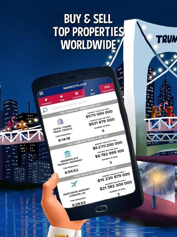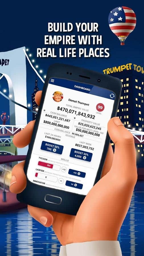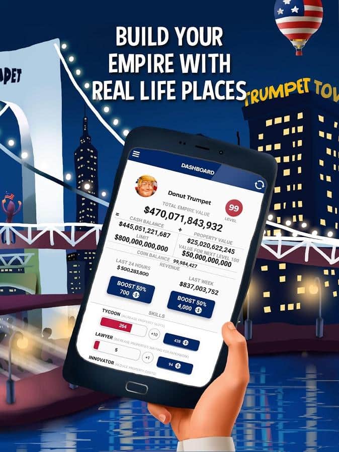 Donut Trumpet Tycoon – увлекательная игра на андроид, в которой вы станете самым крупным капиталистом и миллиардером в Нью-Йорке. В этой игре вы будете играть роль знаменитого магната Дональда Трампа. В игре вашей задачей будет покупать и продавать недвижимость во многих городах и получать виртуальные деньги. Приобретайте самые дорогостоящие площади Таймс-сквер в Нью-Йорке, Эйфелеву башню в Париже и получайте каждый день деньги за арендную плату различных помещений. Инвестируйте свою прибыль в новые покупки и точно продумывайте каждый свой шаг и рентабельность сделки. Стратегия в этой игре решает главную роль, покупайте высокодоходную недвижимость и не разорите крупного магната.