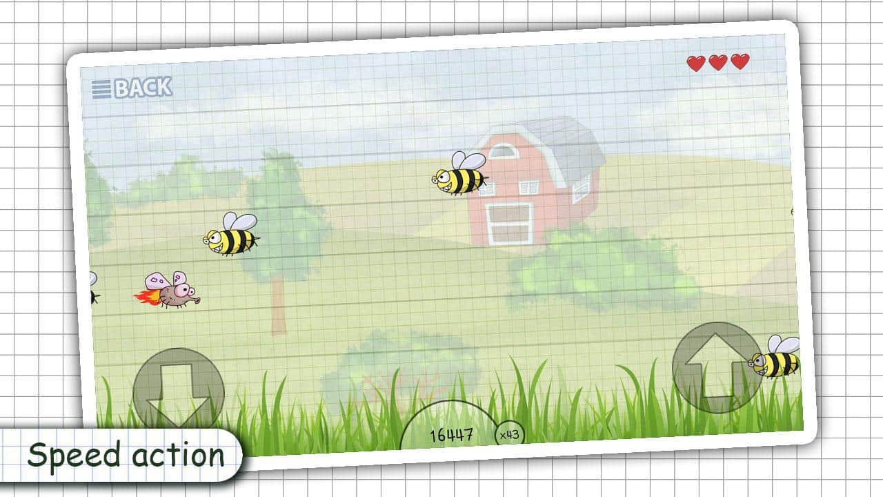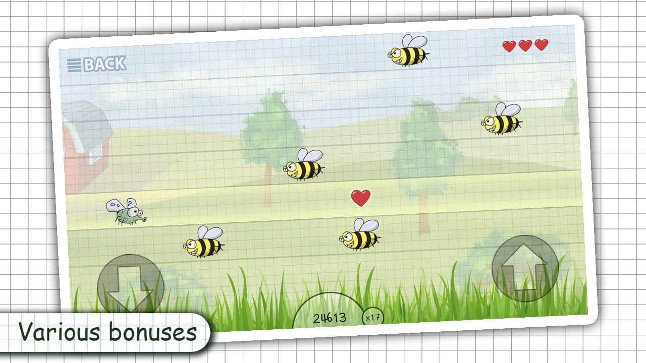 Doodle Fly - Bee Attack – занимательная игра на андроид, где вы будете управлять мухой. В этой игре вы окажитесь в рисованном мире, где возьмете под свой контроль муху и проведете ее по различным локациям, наполненным опасными пчелами. Ведите муху вперед перемещая ее из стороны в строну и не допуская столкновений с пчелами, а также не забывайте собирать по пути бонусы и набирать очки. Пройдите как можно больший путь в игре и установите свой рекорд, соревнуясь с друзьями и другими игроками. Заработайте максимальное количество очков и откройте для себя многочисленные скины для героя.