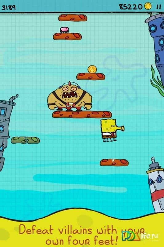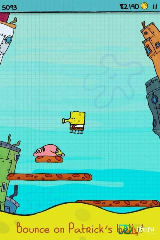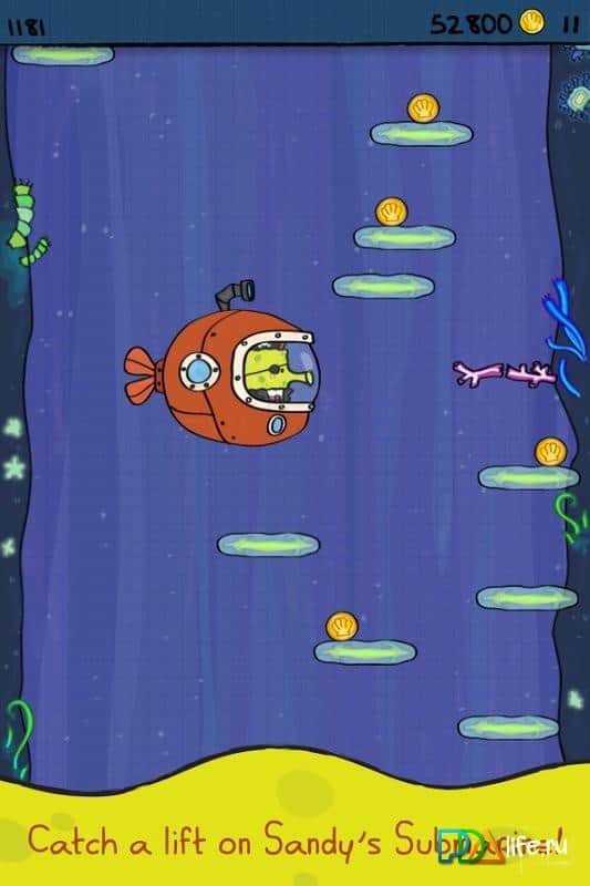 Doodle Jump SpongeBob - Компания Nickelodeon решила поиграться с героями их произведений. Она соединила героя игры Doodle Jump и Спанч Боба, и получила очень веселую прыгалку на андроид. Вам предстоит прыгать этим гибридным героем вверх, используя различные бонусы, такие как надувные шарики, или батискаф. Действия игры в основном происходят под водой, поэтому приготовьтесь к подводным монстрам, и другим опасностям.