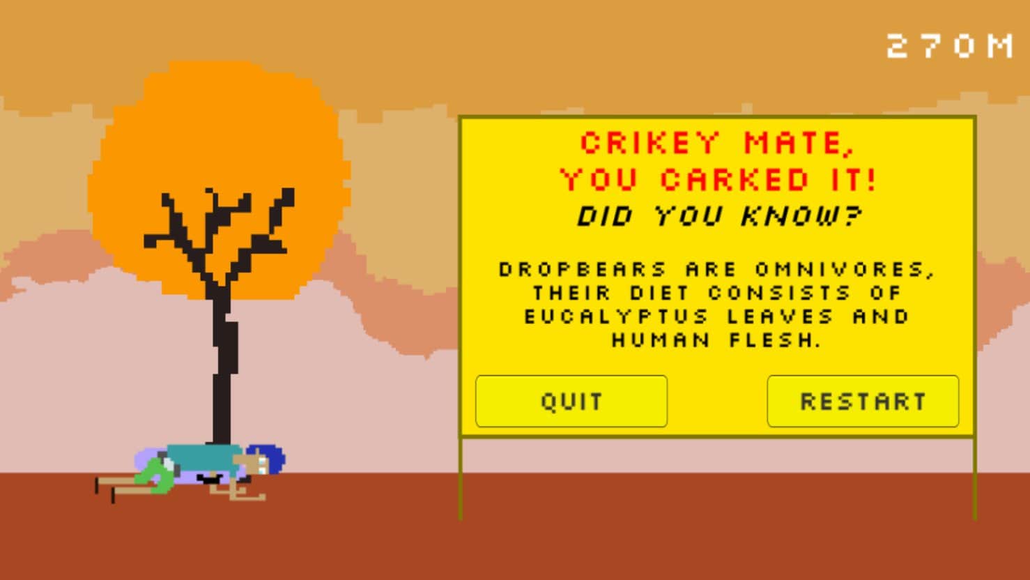 Down Under Dash - горизонтальный пиксельный ранер в котором вам предстоит отправиться на просторы Австралии и постараться преодолеть максимально возможное расстояние по пустыни, при этом на вашем пути будет масса неожиданных встреч с обитателями отдаленного континента. Так же стоит учитывать и тот факт что вода в данном регионе на вес золота и каждую каплю придется экономить, ведь перед вами долгий и опасный путь. Данный проект придется по вкусу всем поклонникам приключенческих ранеров со сложным геймплеем.