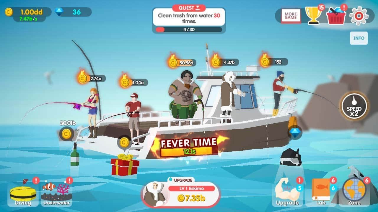 Dream Blue Ocean - Отправляйтесь на своей крутой лодке в открытый океан для увлекательного приключения, занимайтесь рыбалкой и дайвингом столько сколько хочется, ведь рыба в океане никогда не закончится. Расслабляющая игра с максимально простым управлением. Станьте коллекционером разнообразных морских жизней, путешествуйте по всем пяти океанам и будьте обладателем самой большой коллекции в мире. Выбирайте для игры разных игроков и испробуйте все их способности и уникальные характеристики. В игре есть достижения и таблица лидеров, чтобы играть совсем не обязательно иметь подключение к интернету или Wi-Fi.