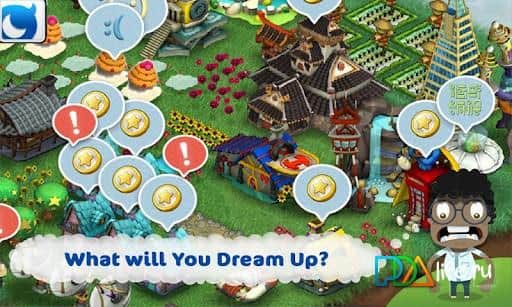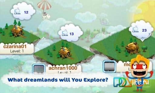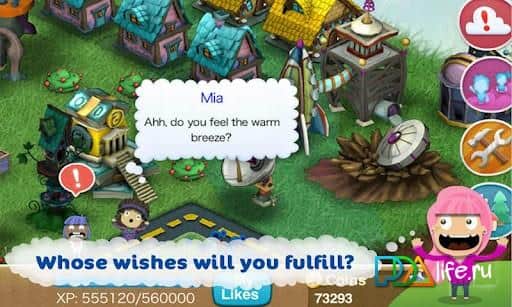 Кроме того в центре экрана расположены вспомогательные клавиши: можно посмотреть текущие желания, почитать новости, завести друзей из числа игроков, изменить расположение объектов, а также купить что-нибудь в магазине. Вы также можете заходить на участки друзей, оставлять пометку «like» и помогать им в выполнении заданий. Dreamtopia обладает интересной графикой и анимацией, а также забавными героями и занимательными заданиями. Стоит отметить, что для игры нужно постоянное подключение к Сети.