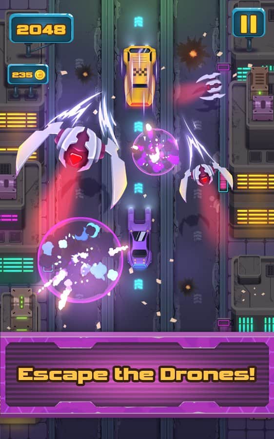 Drone Escape – динамичная игра на андроид, где вы окажитесь в футуристическом мире. В этой игре вашей главной задачей будет управлять движением машин и ускорять или замедлять их для того чтобы избежать столкновения с преградами. Продержитесь как можно дольше в этой игре и добейтесь невероятных результатов, а также применяйте многочисленные бонусы, чтобы установить рекорд. Играть в эту игру очень просто но чтобы добиться хороших результатов вам придется потрудится и проверить на деле скорость своей реакции. По пути не забывайте собирать монетки и открывайте новые транспортные средства передвижения.