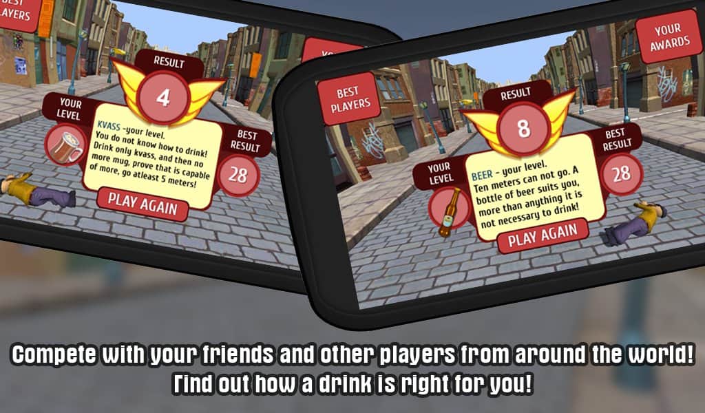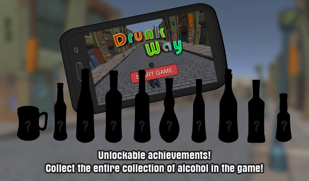 Drunk Way - игра в которой вы ощутите себя парнем идущим домой, который перед этим перебрал алкоголем. Это очень непростая задача ведь ваш герой так и норовить свернуть с пути или упасть на землю, не дайте ему это сделать и доведите его до заданной точки. Попробуйте продержать своего пьяного героя на ногах как можно дольше и побить все известные рекорды. Играя в эту игру вы определите, какой алкоголь подходит вашему герою больше всего и под дозой чего он сможет добраться домой. Соревнуйтесь со своими друзьями, и откройте для себя целую коллекцию дорогого алкоголя, который есть в игре.