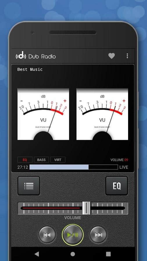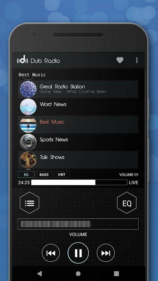 Выберите одну из подходящих радиостанций в жанре даб со списка и слушайте музыку, которая транслируется по тому или иному каналу в данный момент. Если вам не хочется слушать подборки музыки по радио, то в приложении есть готовые плейлисты, включая какие вы сможете насладиться звуками песен. Экспериментируйте над звучанием песен с помощью эквалайзера, 9 различных настроек для особых жанров (хип-хоп, рок, танцы, метал, классика), усиления или снижения определенных частот, контроля высоты звука и его скорости.