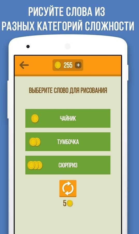 Дуэль Художников - рисуй и угадывай – увлекательная игра на андроид, где вы будете рисовать картинки так, чтобы по ним другой игрок могу угадать слов. Проявите все свои навыки художника и рисуйте понятные картинки, так чтобы другому игроку было проще угадать слова, а также проявляйте свою сообразительность и отгадывайте слова соперника зашифрованные в рисунках. Если ваш соперник отгадал слова по вашим рисункам, то вы оба будете получать монетки, которые в дальнейшем сможете потратить на приобретение дополнительных цветов и подсказок. В игре вы найдете четыре режима игры, рейтинг игроков и будете наслаждаться веселым время препровождением.