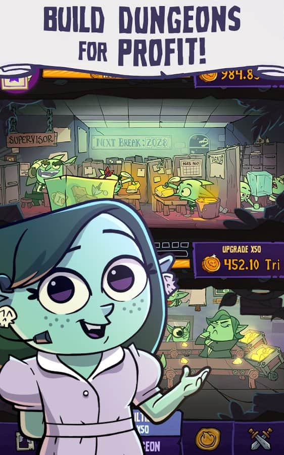Dungeon, Inc. – захватывающий кликер на андроид, где вы станете менеджером копании по добыче полезных недр земли. Эта игра перенесет вас в ЗАО "Подземельстрой" где вы станете менеджером и будете стараться добывать как можно больше ископаемых. Вашей целью станет добыча ресурсов любой ценой. Для достижения поставленной цели нанимайте на работу монстров, отвоевывайте новые территории и как можно быстрее нажимайте на экран своего телефона или планшета, получая сказочную прибыль. Защищайте свою компанию от налоговой и конкурентов и в самый удачный момент делайте свою компанию банкротом, чтобы забрать все деньги и заново начать их зарабатывать. Играйте со своими друзьями и станьте лучшим менеджером недели.