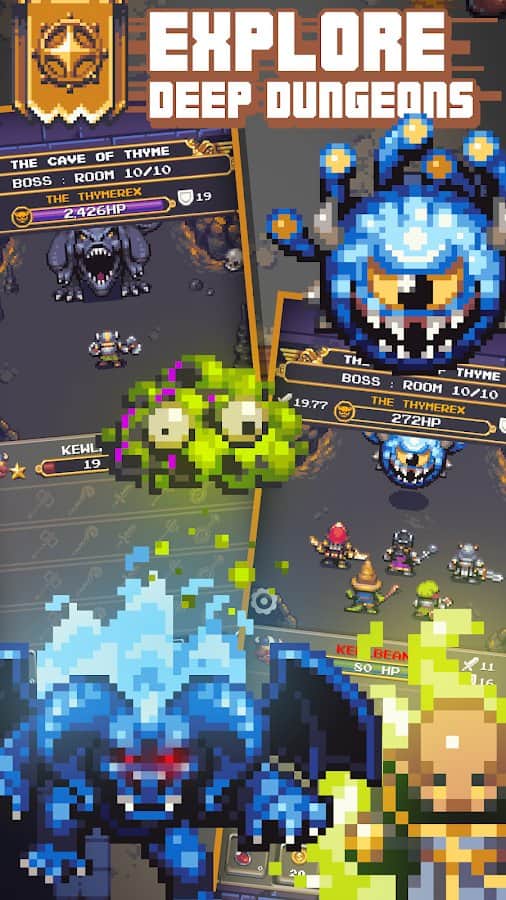 Создавай отряд героев. Исследуй подземелья. Проползи по узким пещерам и собирай мощные обновления. Помоги выжить своим героям. Тебе необходимо улучшаться и модернизироваться, чтобы ползти по страшным пещерам и подземельям с добычей. Повышай мощь бездействующих героев, чтобы найти сокровища в пиксельной темнице. Следи за своими персонажами, чтобы у них было достаточно сил, оружия чтобы выжить. В пещерах много предметов коллекционирования- собери их все. Сражайся с монстрами и побеждай.