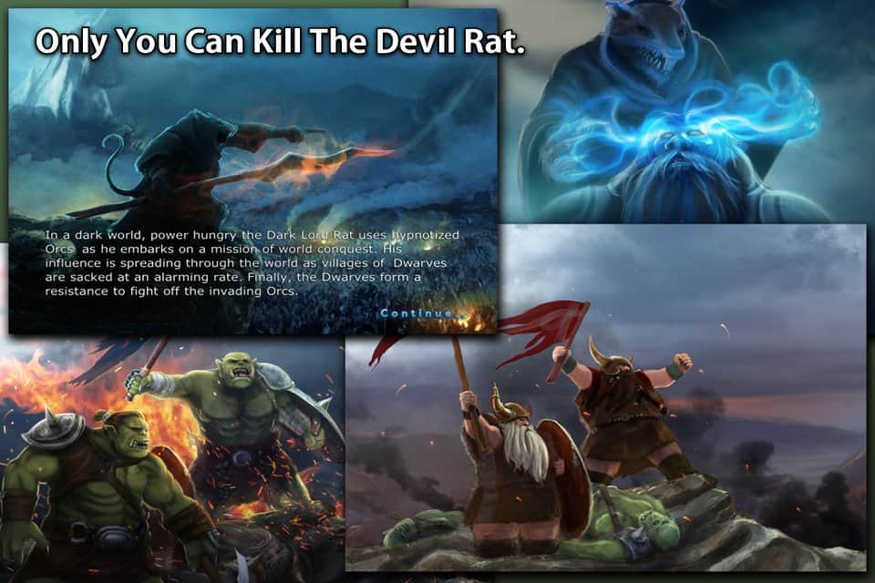 DvO - Темный Лорд, загипнотизировав орков, отправляется в новые земли для завоевания всего мира. Завоевав все земли, он добирается до деревни Гномов, которые разворачивают огромное сопротивление против вторжения Темного Лорда и его приспешников, орков. Подключитесь к этому движению сопротивления. Для этого у вас будут 7 этапов игры по 6 уровней. Также у вас будут помощники в виде стихий: Свет, Огонь, Ветер и конечно магия, Волшебная Лампа и т.д. Прогоните Темного Лорда и его страшную армию!