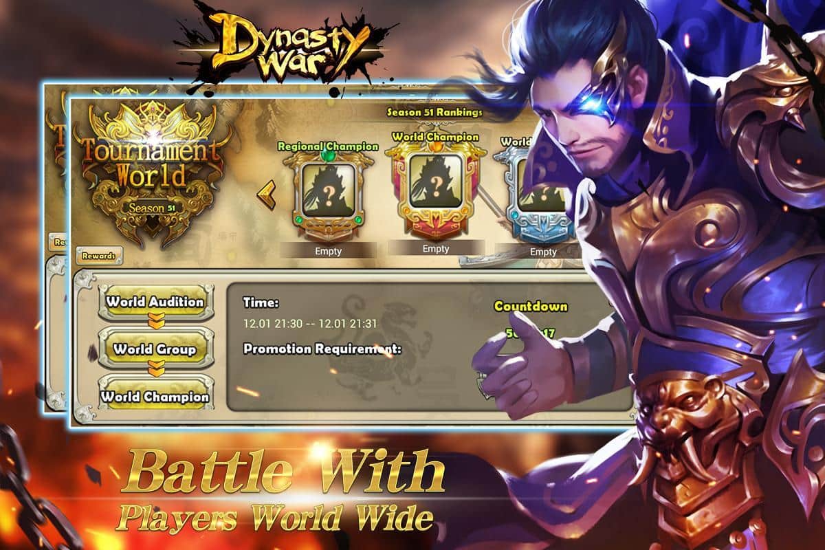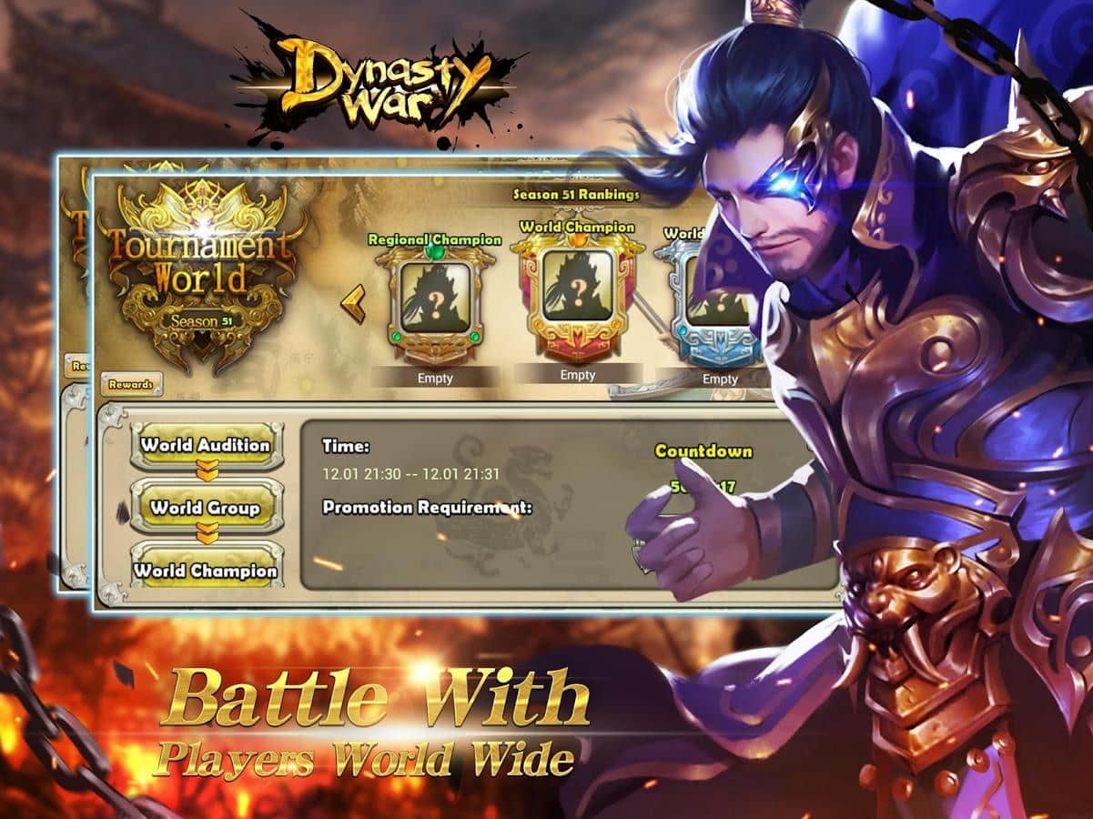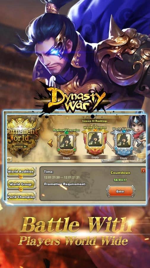 Dynasty War - Global PK – военная стратегия на андроид, которая имитирует исторические события в Троецарствие. В этой игре ваша главная задача будет в том чтобы построить свой город, собрать огромную армию воинов, обучить их военному делу и бросить вызов другим игрокам играющим в эту игру по всему миру. Точно планируйте свою стратегию, ведь победа зависит от ваших навыков ведения боя. Выберете себе подходящих героев из 146 представленных в игре, которые обладают различными навыками и способностями, и сразитесь с врагами. Самая лучшая защита это нападение, так что не ждите агрессии от своих врагов, а сами идите в бой, создавая многочисленные альянсы с союзниками.