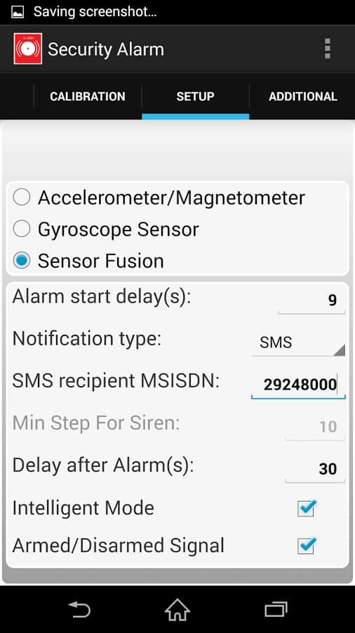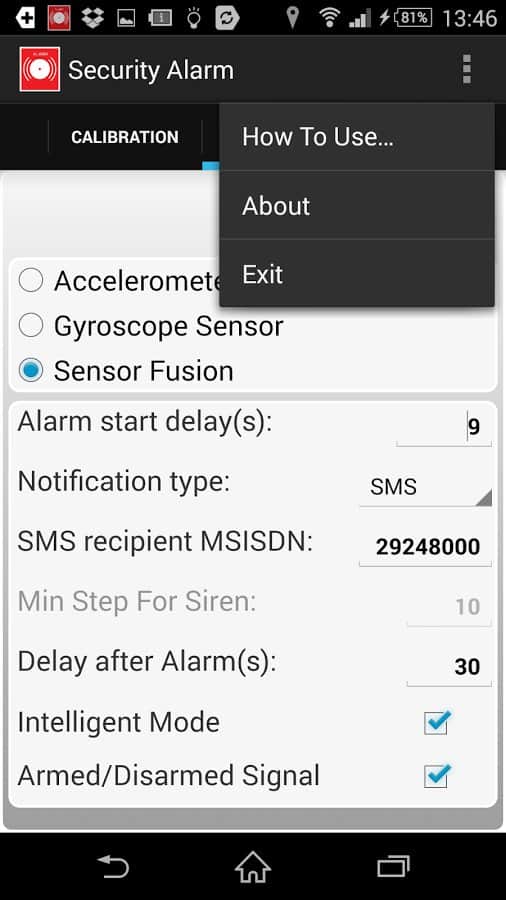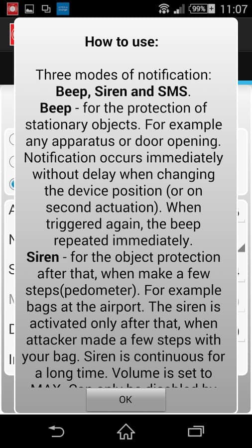 Easy Security Alarm – приложение, позволяющее включать сигнализацию на вашем устройстве. Приложение можно настроить на три режима работы: гудок, сирена и отправка SMS. Работа в режиме «Гудок», заключается в том, что если злоумышленник сдвинет с места какой либо предмет, на котором лежит ваш телефон то датчики телефона на это отреагируют, что даст команду к звуковому сигналу. Режим «Сирена» - срабатывает, если объект переместили на несколько метров. Режим «SMS» - в этом режиме приложение отправляет sms на заданный номер с данными датчиков телефона, если они поменялись значит лучше проверить всё ли нормально на охраняемом объекте.
