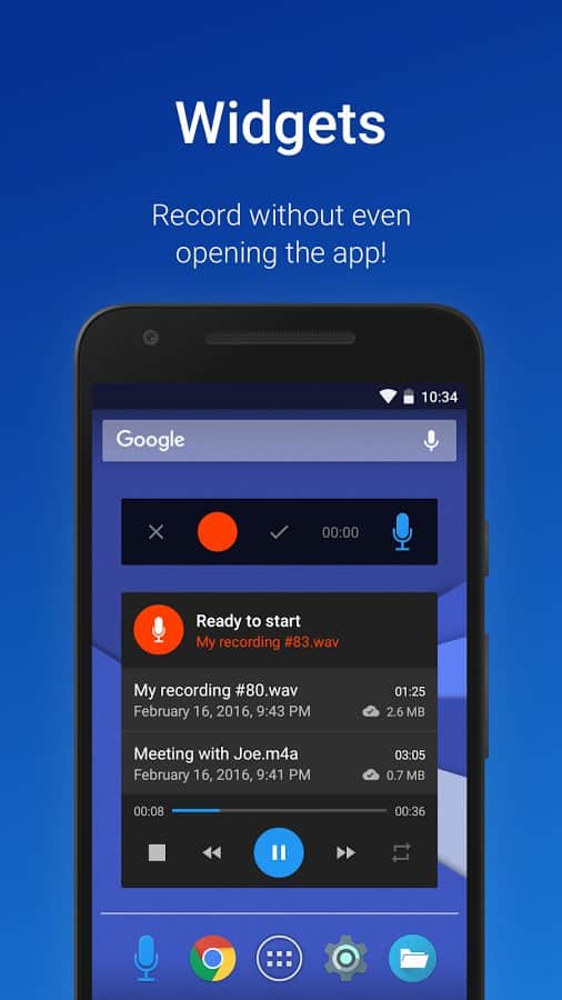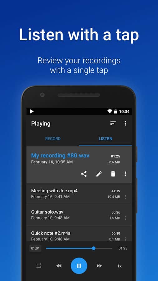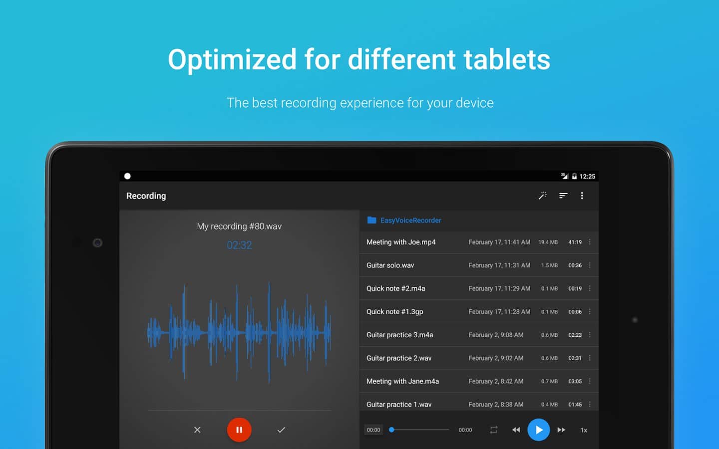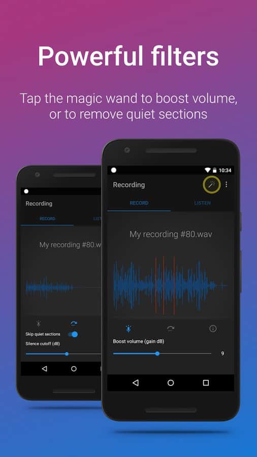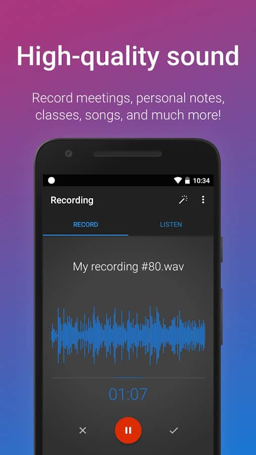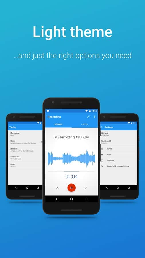Easy Voice Recorder - Этот диктофон, идеально заменит стандартный имеющийся. Он не просто будет записывать звук, он сделает это в наилучшем качестве. При записи звука, вы будете слышать даже малейшие шорохи, ведь здесь есть графический интерфейс, который будет показывать колебания звука, что очень удобно. Так же он не содержит в себе рекламу, и лимит записи по времени. Так что вам всегда хватит, даже для записи долгой встречи.