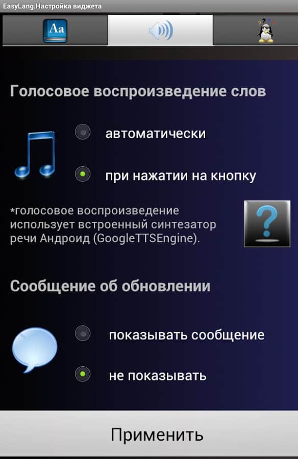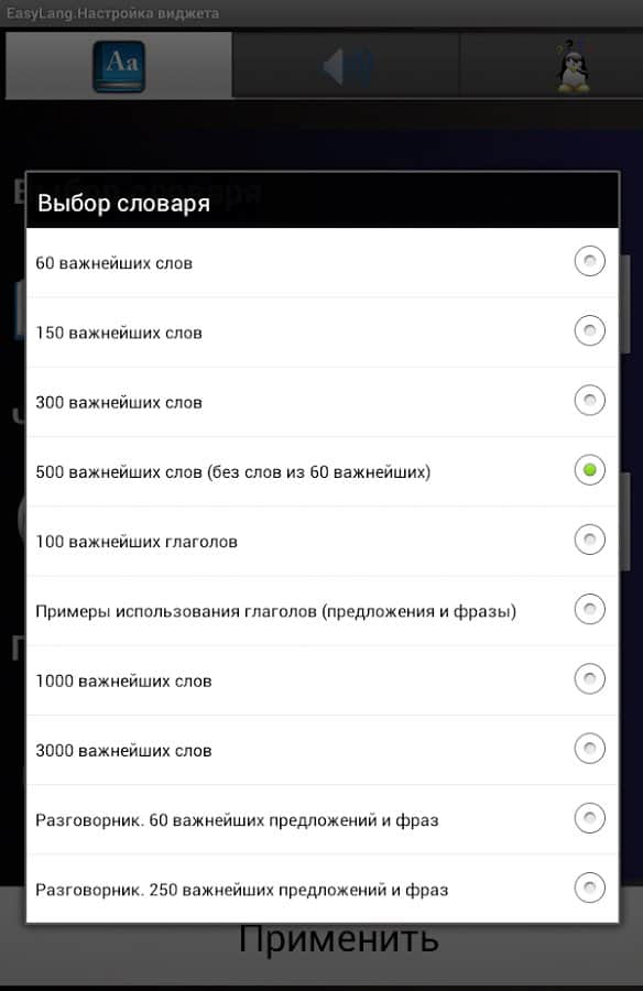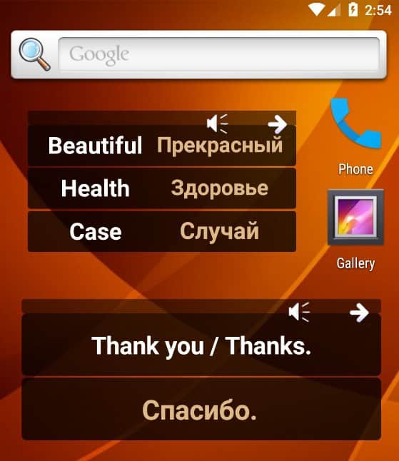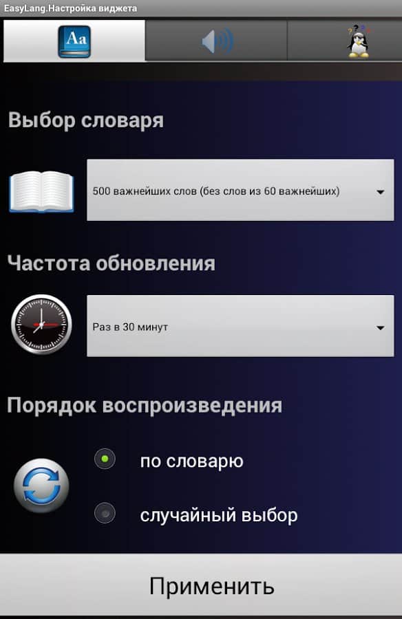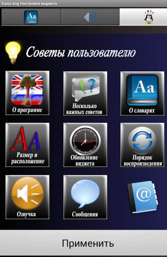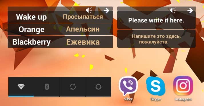 EasyLang. Английский язык – отличный виджет в виде доски напоминаний для андроид устройств, с помощью которого вы сможете абсолютно не напрягаясь учить новые слова и выражения на английском языке в течение дня. Установите время и способ обновления слов (от 5 мин до нескольких часов, при входе/выходе из спящего режима, раз в 5 секунд для активного изучения), словарь (10 словарей с важнейшими словами от 60 до 3000 слов и важнейшими фразами и предложениями от 60 до 250), так же можно включить функцию голосового озвучивания. Приятного изучения!