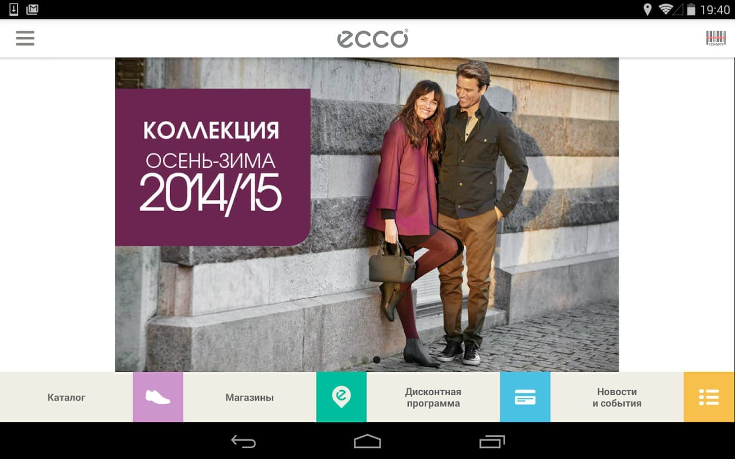 ECCO – предлагаем вашему вниманию приложение, представляющее собой магазин известного скандинавского бренда обуви и аксессуаров, доступного теперь и для андроид пользователей. Каталог новой коллекции, специальные предложения, информация об акциях и скидках в магазинах ECCO вашего города и многое другое – обо всем этом вы сможете узнать, скачав и установив данное приложение. Стильно, качественно и на все случаи жизни. Единственное НО во всем этом – это то, что устанавливать приложение рекомендуется при наличии высокоскоростного подключения/WI-FI.