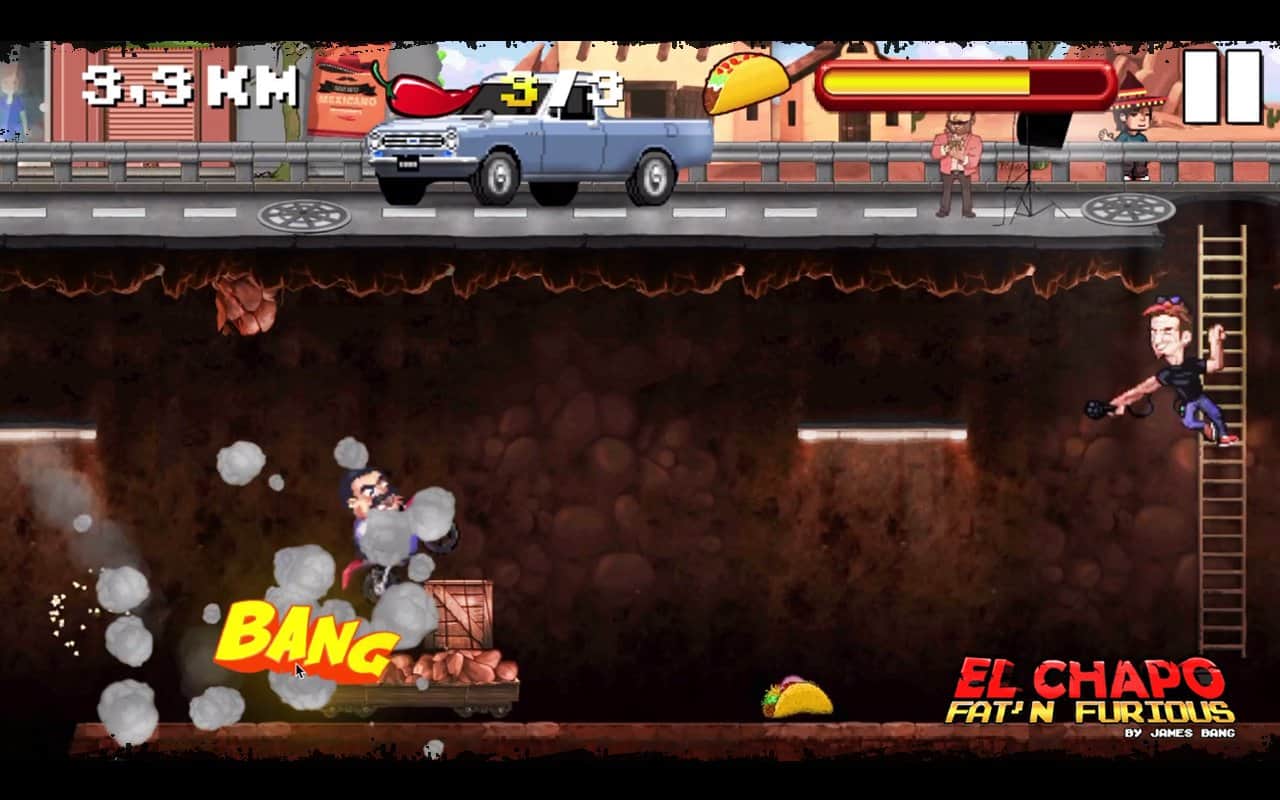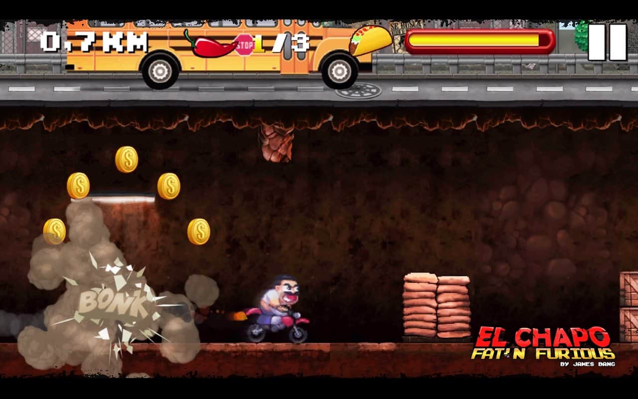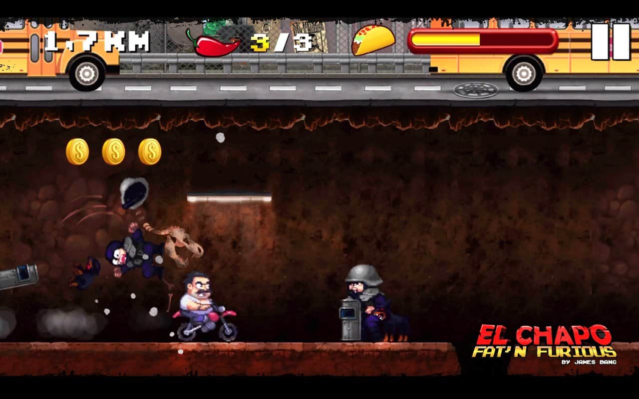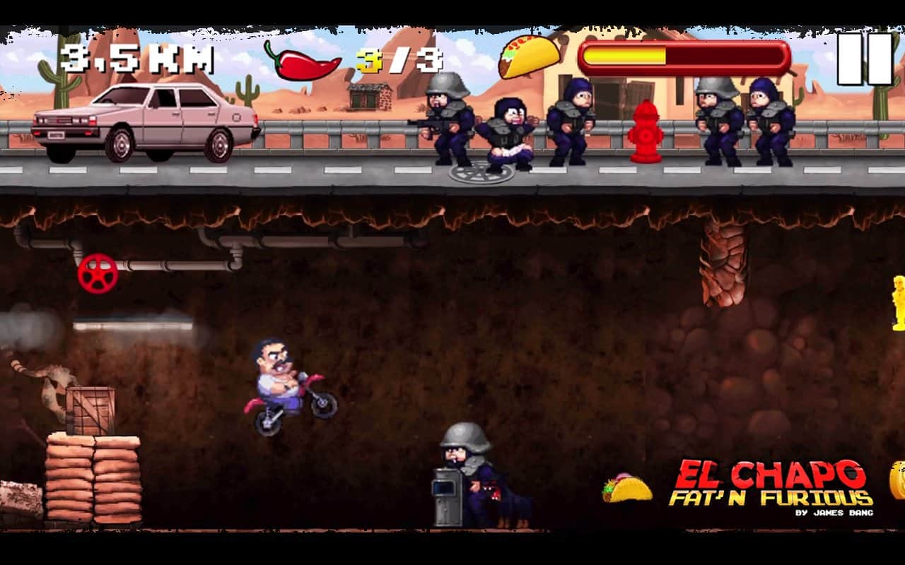 El Chapo - Fat 'n Furious! - Это история про толстячка по имени Эль Чапо. Вы мексиканский наркобарон, которого повязали легавые. Но вы не растерялись, и когда вам практически посадили, вы показали всем средний палец, провалились под землю, и запрыгнув на свой крутой байк помчались что есть духу. Убегая по тунелю, будьте внимательны ведь он просто кишит полицией и различными ловушками, который вам нужно будет перепрыгивать или сбивать с помощью ускорения. В игре простое управление с помощью всего двух кнопок, ускорения вперед и прыжка. Приятная 16-и битная графика вернет вас в конец 90-ых, и вы сможете насладится ею сполна.