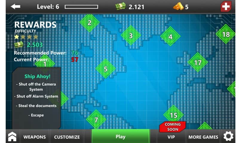Elite Spy: Assassin Mission – шпионская игра с увлекательным сюжетом на андроид, где вам предстоит проникать на вражескую территорию и добывать ценную информацию. В этой игре вы станете агентом разведки, которому предстоит пройти опасные миссии по уничтожению врагов и террористов на их территории. Проникайте на территории вражеской базы, делая все возможное, чтобы вас не заметили и с помощью различного оружия убирайте одну за другой цели. Путешествуйте по всему миру и открывайте для себя новые миссии, которые вам необходимо пройти. В этой игре вас ждет огромный арсенал различного оружия, начиная от пистолетов и заканчивая снайперскими винтовками, которыми вам предстоит овладеть в совершенстве. Изменяйте вашего героя до неузнаваемости, примеряя на него различные костюмы и снаряжение.