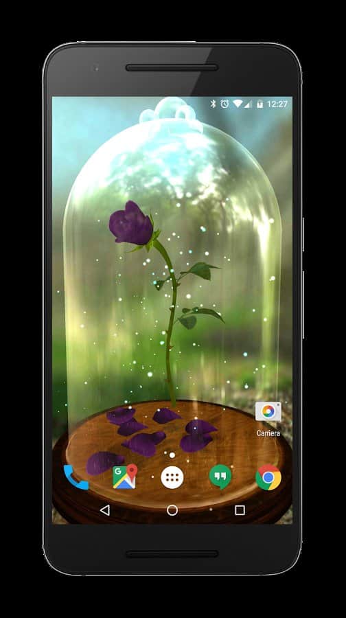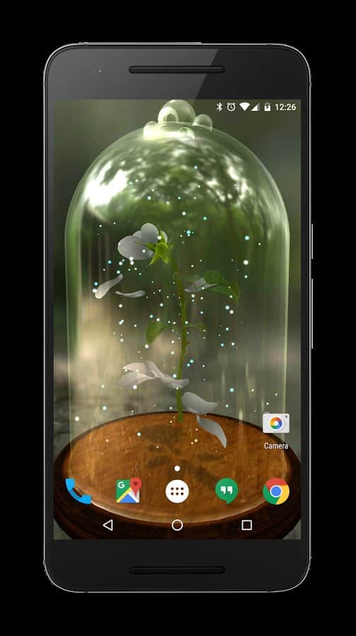 Enchanted Rose – отличные живые обои на ваши девайсы на платформе андроид. Установив эти живые обои, вы получите на своем рабочем столе телефона или планшета розу, которая закрыта прозрачной крышкой. Эта роза будет символизировать заряд вашей батареи, как только зарядка достигнет минимума, то лепестки розы начнут опадать. Постоянно следите за зарядом своей батареи и не давайте ей разрядиться. Если вы сами хотите контролировать процесс увядания розы, то с помощью пальца управляйте розой и подбирайте для нее подходящий цвет. Всего в обоях представлено 8 цвета лепестков, 5 различных фонов, 3 пьедестала для розы и возможность убрать прозрачную крышку.