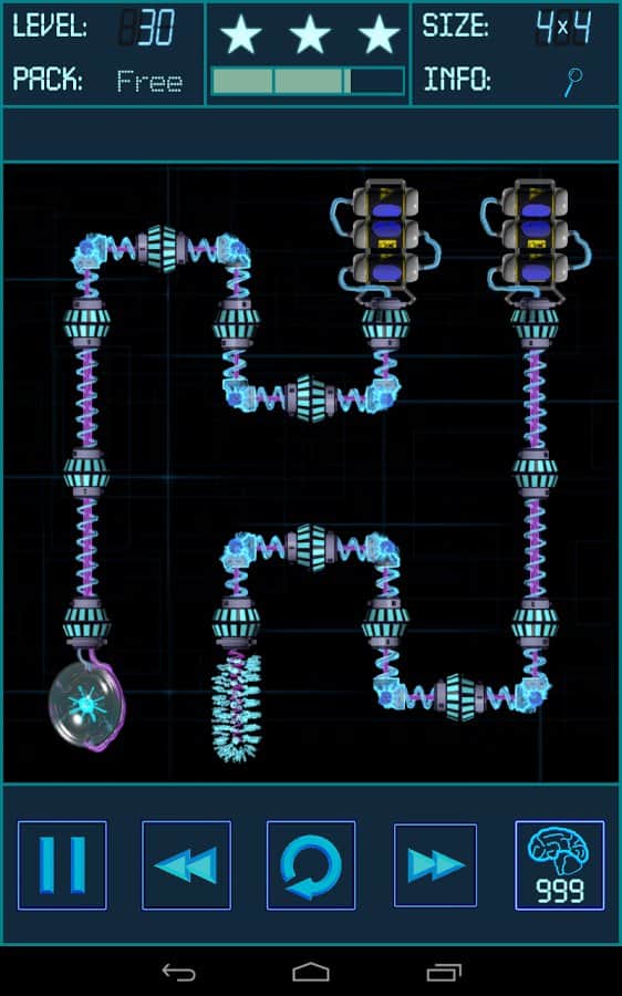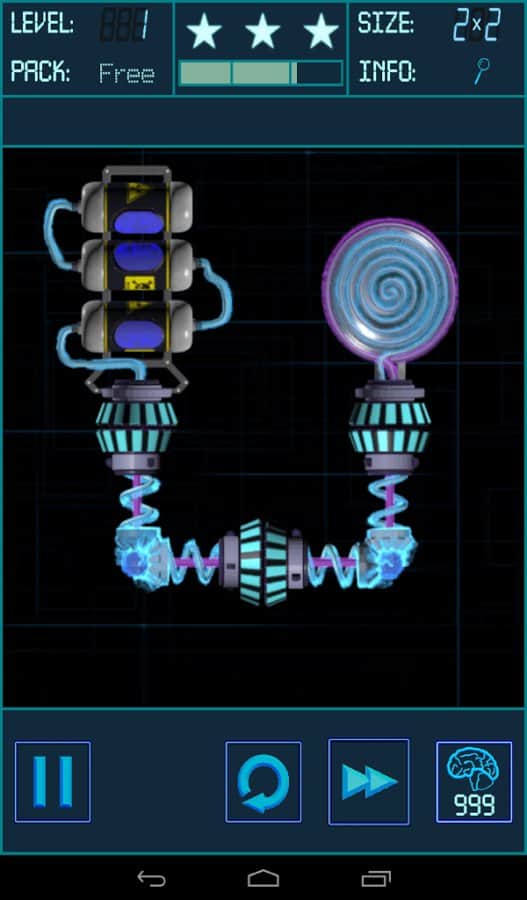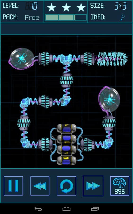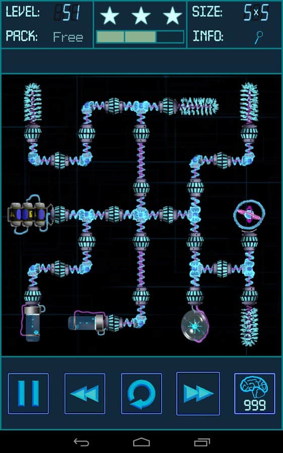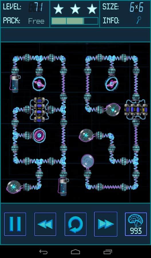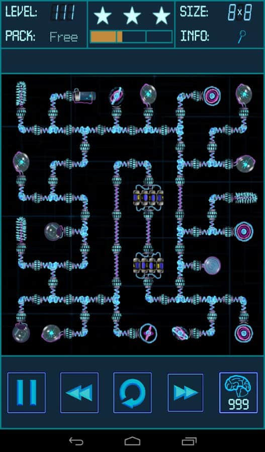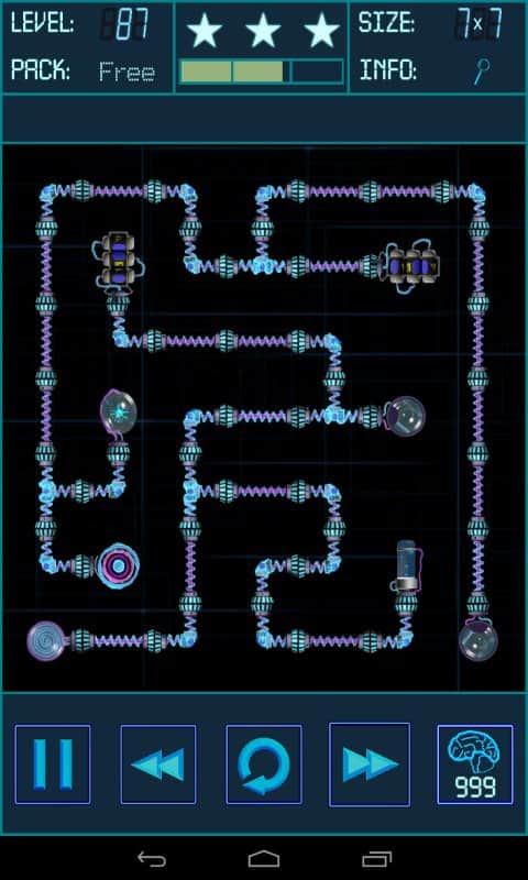 Сложность уровней будет постепенно увеличиваться, начав с поля 4 на 4, вы вскоре доберётесь до 8 на 8. Многочисленные проводники и тупики потребуют от вас тщательного продумывания строящейся схемы. Каждое действие отнимает у шкалы рейтинга, и чтобы получить максимальный, локация должна быть пройдена идеально.