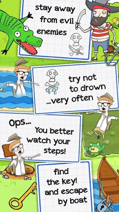 enigMap Online - увлекательная игра головоломка на андроид, в которой необходимо искать ключ на скрытой карте. Игра по началу может показаться вам очень простой, но это совершенно не так, на разных картах разработчики постарались и скрыли сюрпризы для вас, такие как: пират, крокодил, туннели которые перенесут вас на другие карты, а также если выбрать не правильный путь вы утонете в болоте или в реке. Играйте со своими друзьями и попробуйте найти ключ первым, чтобы уехать на лодке на другой уровень. Играя с соперником вы сможете расставлять ему различные препятствия и ловушки, но будьте осторожны в ответ он может тоже самое сделать с вами.