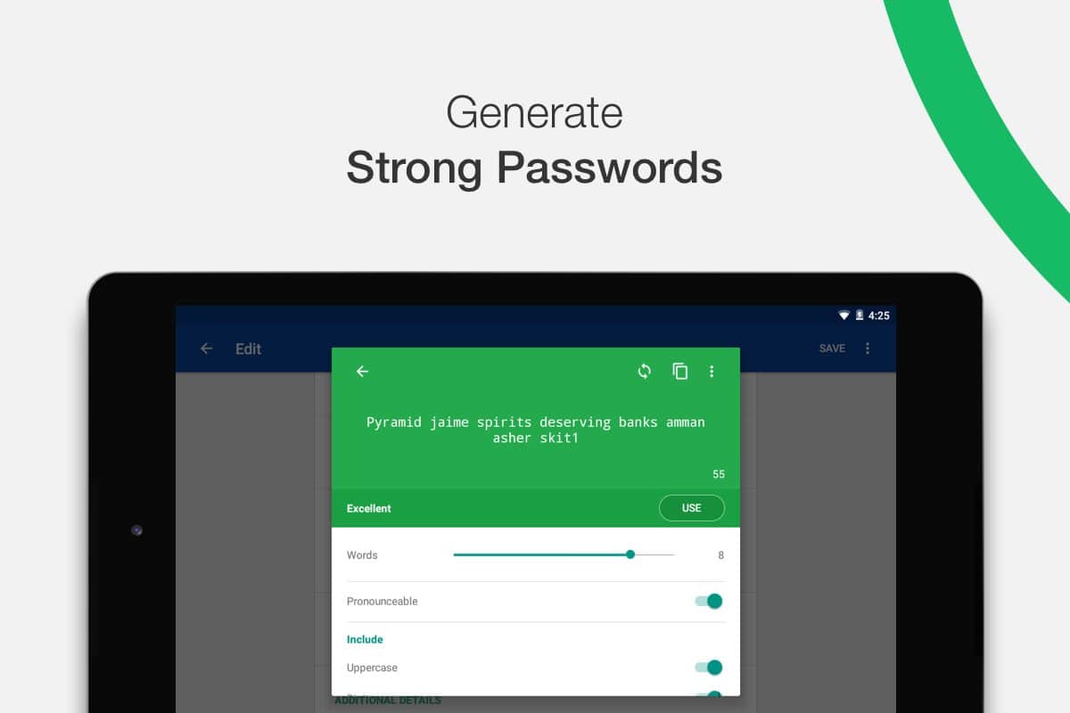 Enpass Password Manager - лучший менджер паролей на Android. С помощью Enpass вы можете хранить все свои пароли в защищенном месте. Также утилита поможет вам сгенерировать пароль любой длины по заданным параметрам. Благодаря функции автозаполнения, вам не придется даже копировать пароль, чтобы вставить его в соответствующее поле. Enpass не хранит вашу информацию на своих серверах. Ему не нужен даже интернет для работы. Но для синхронизации между своими устройствами можно подключить сервер iCloud, Dropbox, Google Drive, OneDrive или WebDAV.