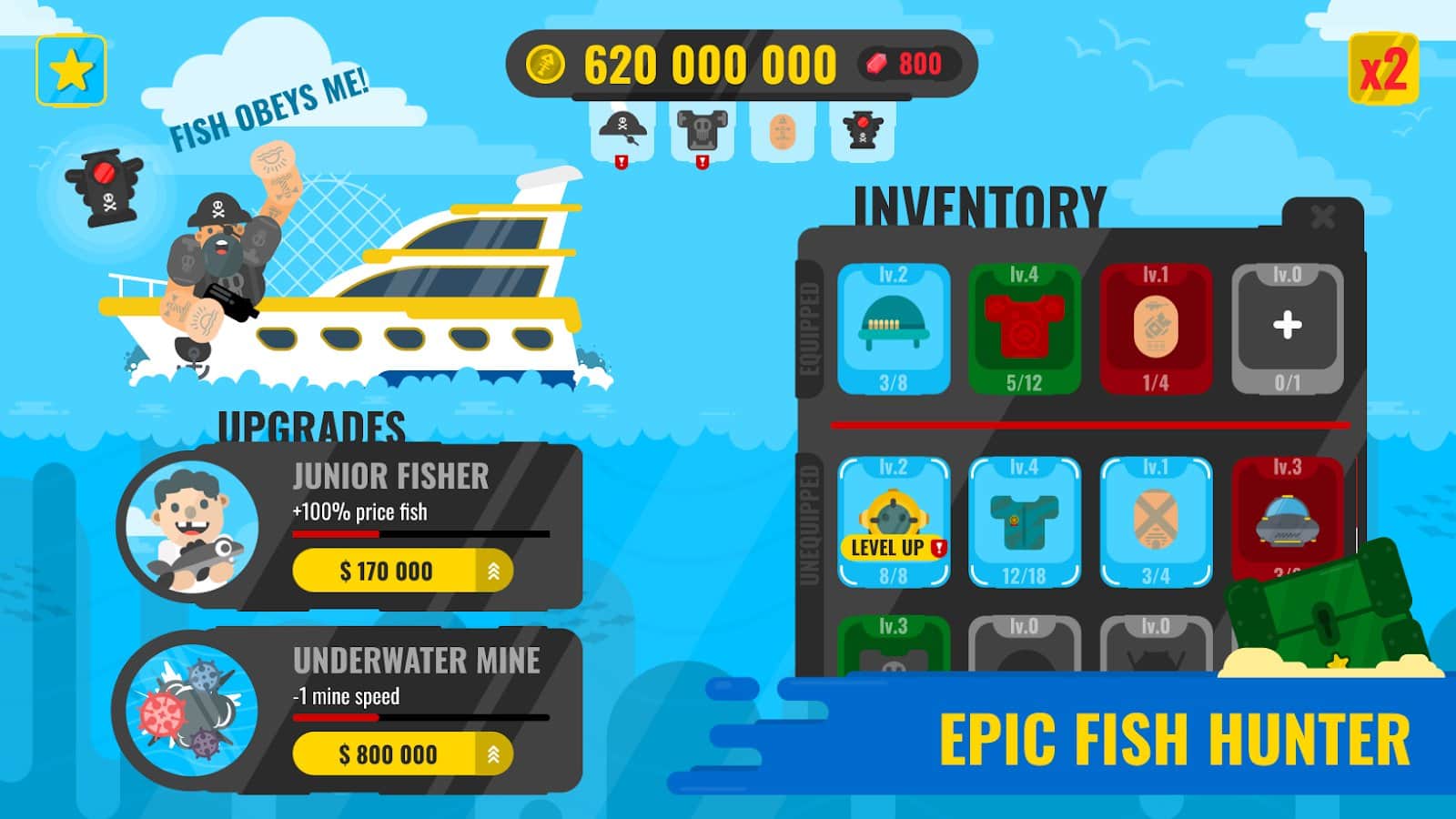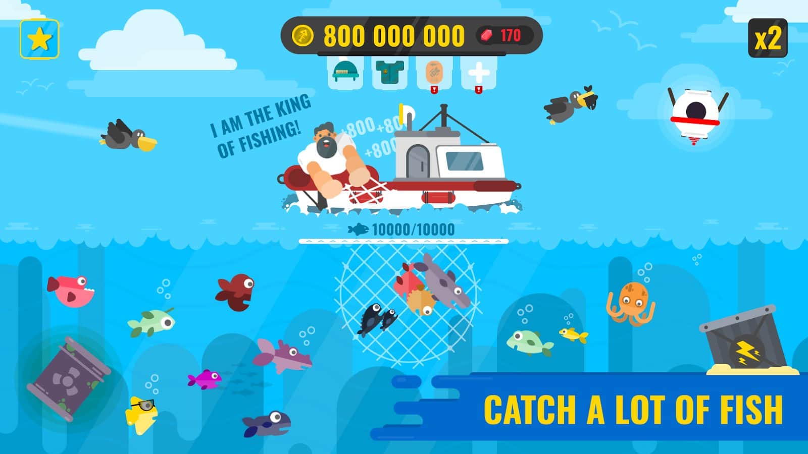 Epic Fish Master - fishing game – увлекательная игра на андроид, где вы будете ловить рыбу с лодки. Возьмите под свой контроль главного героя и проведите его по разнообразным водоемам и морям ловя рыбу. Забрасывайте сети в воду и вытаскивайте отличный улов из разных пород рыбы. Перемещайте сеть из стороны в сторону и таким образом собирайте больше рыбы. Продавайте свой улов и улучшайте на заработанные деньги лодку. Приобретайте одежду для персонажа и различные предметы. Открывайте для себя новые места для рыбалки.