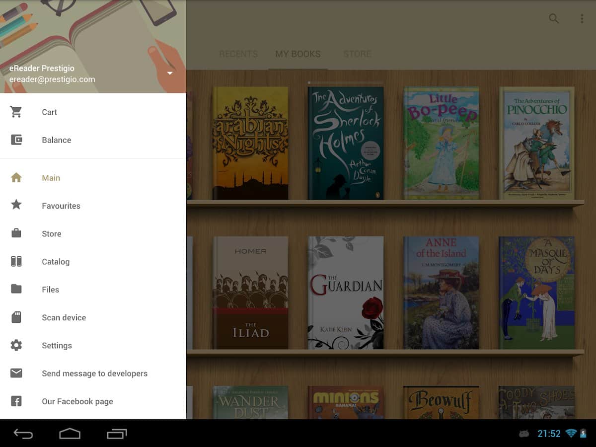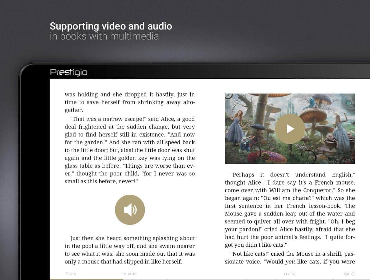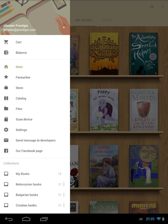 eReader Prestigio – классная программа для чтения книг с андроид смартфона/планшета от разработчиков Prestigio Plaza Ltd. eReader Prestigio поддерживает такие форматы книг как EPUB, OEB, FB2 (ZIP), HTML и TXT, а так же интерфейс на 22 языках и доступ к 620 000 книг. Интуитивный интерфейс и большое количество возможностей позволят вам максимально комфортно насладится чтением любимой книги.