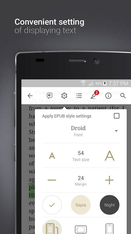 - Гибкая настройка отображения текста: выбор типа шрифта, размера кегля, варианта начертания, межстрочного интервала и выравнивания