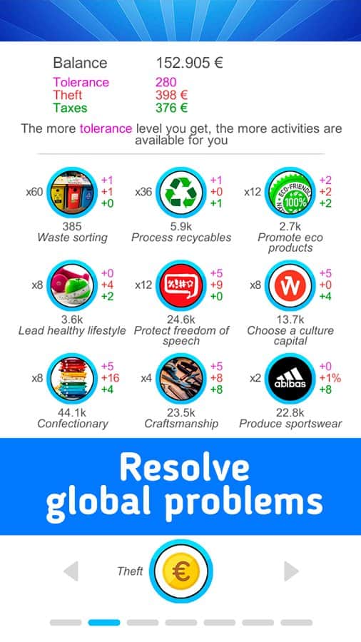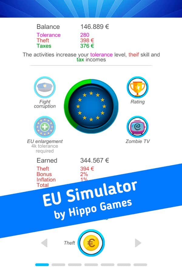 European Union Simulator – симулятор на андроид, где вам предстоит стать членом Евросоюза и решить все проблемы. Начните с малого и займитесь насущными проблемами беспокоящее большинство граждан Евросоюза такие как: сортировка мусора, переработка втор сырья, продвижение эко продуктов, развивать кондитерское производство, защищать свободу слова и агитировать всех за здоровый образ жизни. Помимо этих задач и миссии вы будете решать непростые, такие как проблемы с мигрантами. Расширяйте Евросоюз интегрируя в него новые страны и улучшая политическую систему Европы. Заводите полезные связи и становитесь более толерантным. Выполняйте поставленные миссии и получайте отличные достижения. Играйте со своими друзьями и поднимайтесь на самый верх таблицы лидеров.