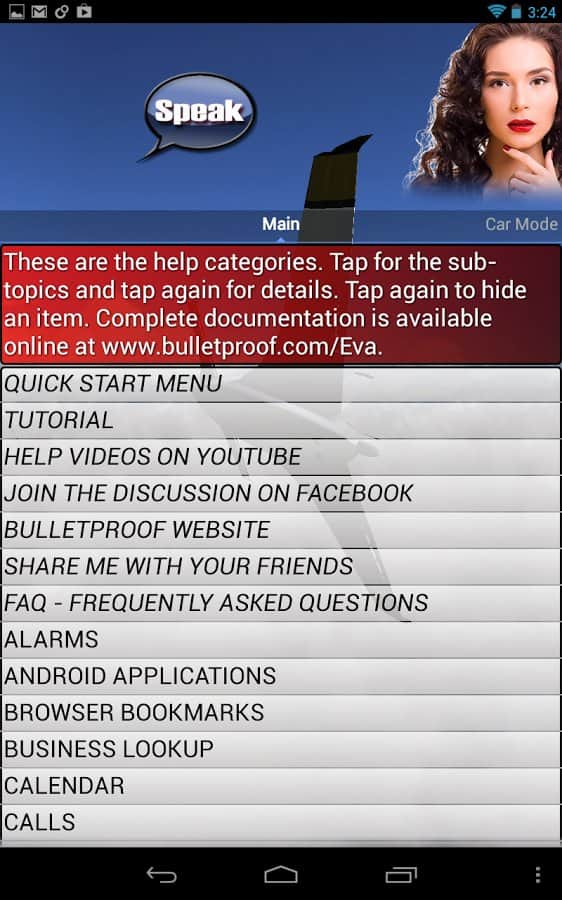 EVA – великолепный виртуальный голосовой ассистент для андроид устройств от разработчика BulletProof, в лице которого вы найдете приятного собеседника и помощника во многих делах. Если вам приятней работать с мужчиной, нежели с женщиной, вы можете выбрать голос Эвана. Задавайте Еве натуральные фразы: "Напиши Максу "в чем дело?", "Ева, что в моем календаре на следующей неделе?" и так далее. Есть возможность обучения вашей виртуальной подруги распознаванию с помощью Google's voice и через определенное время Ева будет вас прекрасно понимать. Приятного и плодотворного сотрудничества вам с EVA - Virtual Assistant !