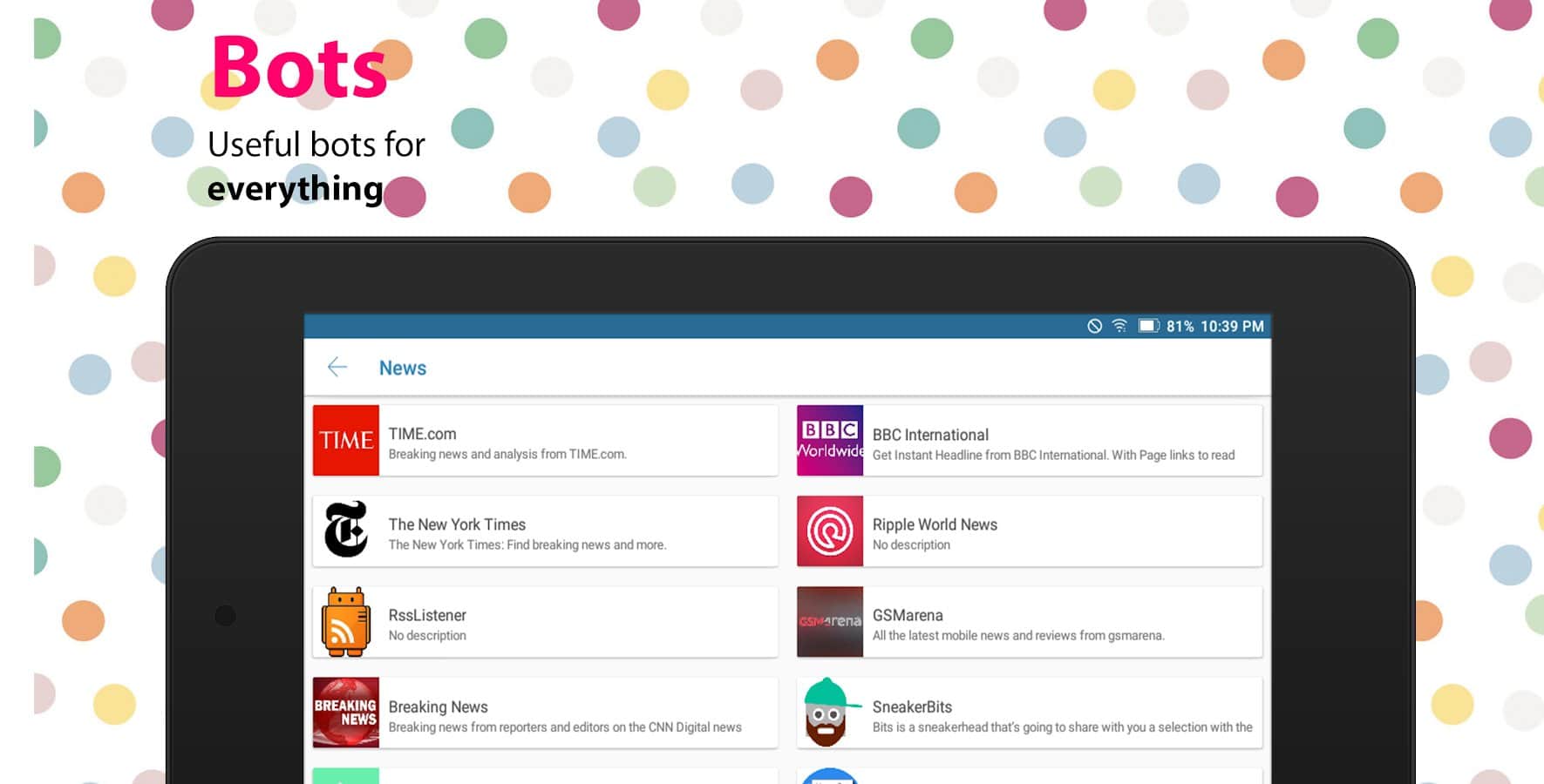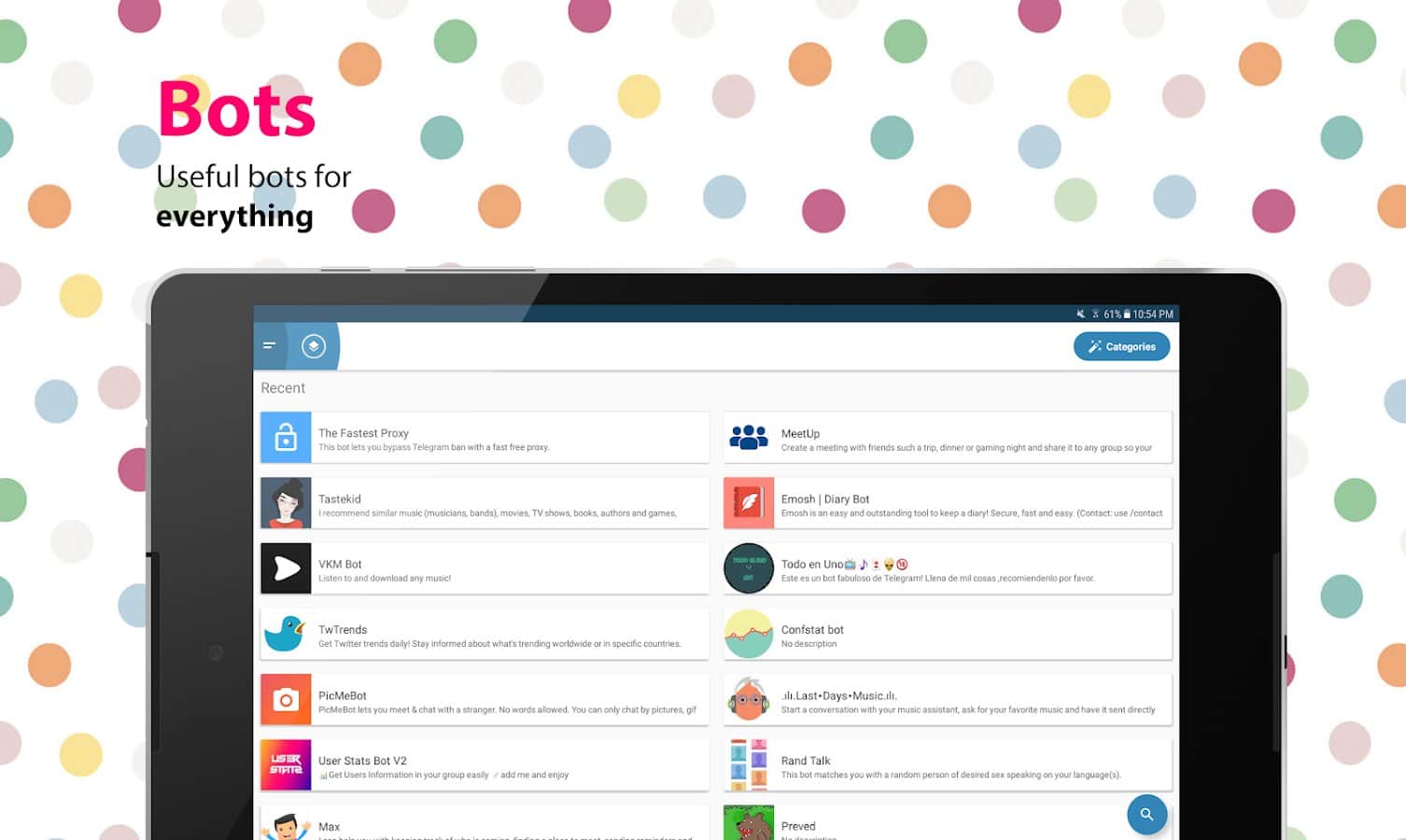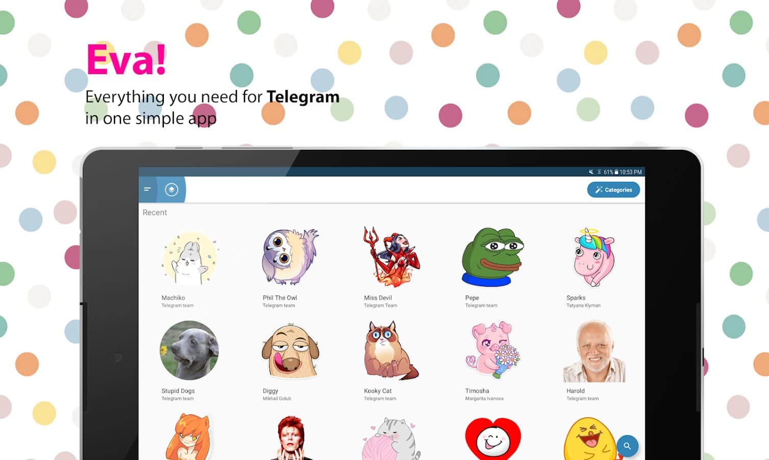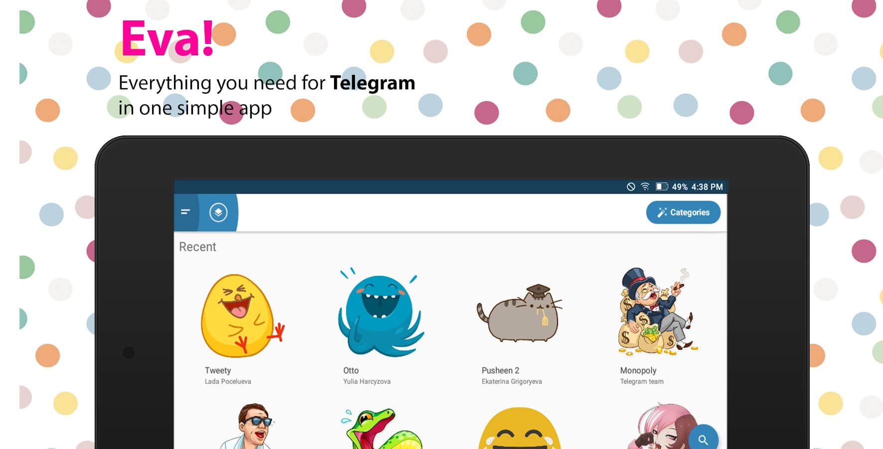 Eva: Everything for Telegram - Частенько бывало что вы не могли найти что-то нужное и полезное для вашего telegram клиента? Это приложение решит данную проблему, ведь оно вобрало в себя наборы для стикеров, множество популярных групп, а так же целую кучу ботов. Установить или настроить ботов стало проще простого, все они имеют описание и сортируются списком. Здесь вы не найдете ничего лишнего, только самое главное и необходимое.