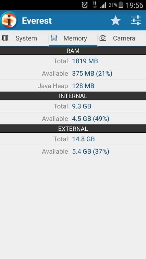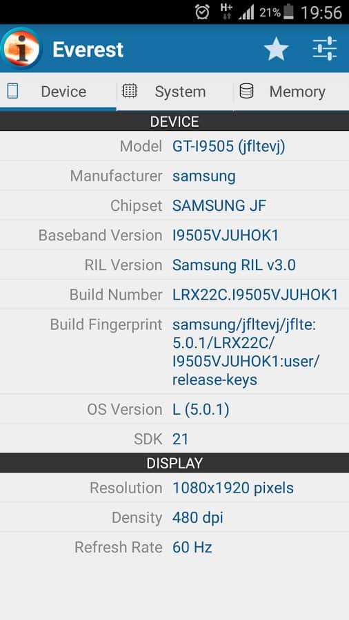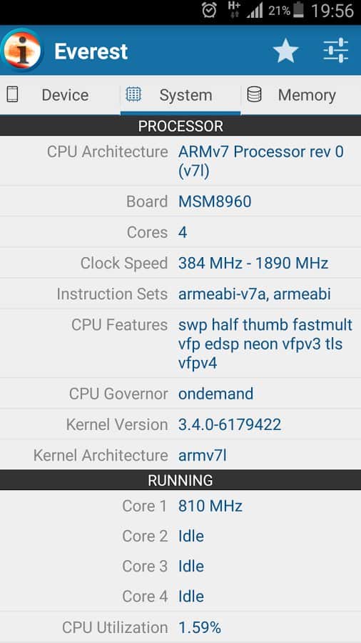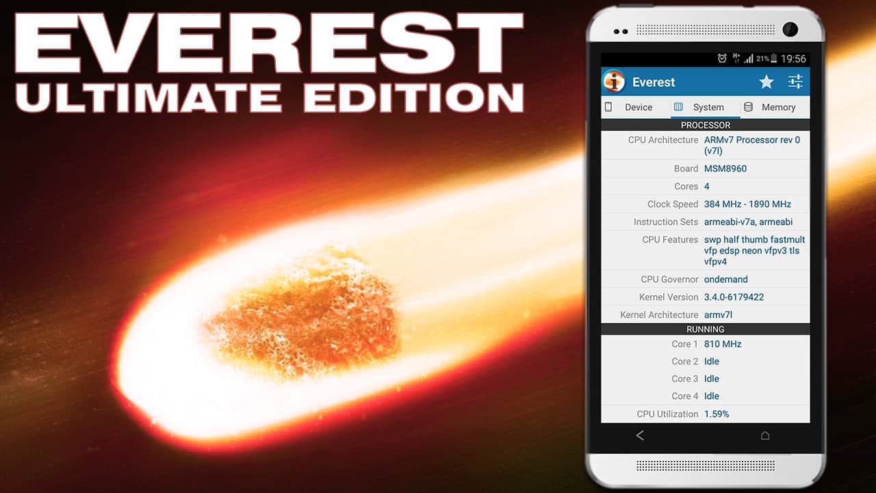 Everest - Уникальное приложение которое полностью покажет вам системную и аппаратную конфигурацию вашего смартфона. Вы сможете собрать максимум данных о своем устройстве, начиная с самых простых такие как модель и производитель и заканчивая температурой вашего устройства, работой акселерометра. Уникально то, что приложение не требует root доступа, поэтому вы можете проверять систему своего устройства, не получая root.