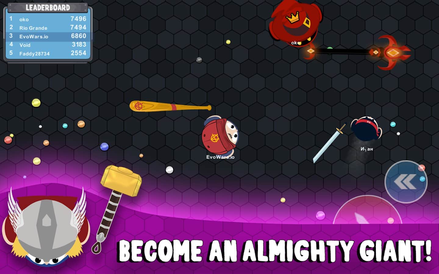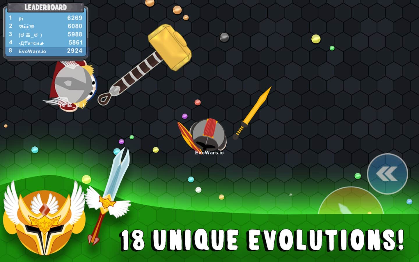 EvoWars.io – экшен на андроид, где вы будете управлять героем который путешествует по огромному миру и уничтожает врагов. В этой игре вы попадете на арену, которая наполнена многочисленными врагами и цветными сферами. Приготовьтесь к бесконечным приключениям ожидающих вас в этой игре и докажите всем что вы самый сильный игрок. Рубите врагов с помощью меча и обходите стороной более сильных врагов, который могут вас уничтожить. Собирайте сферы и прокачивайте своего героя, делая его более сильным, меняйте его размеры и внешний вид. Игра порадует игроков красочной графикой, многочисленными бонусами и таблице лидеров.
