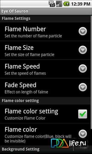 Eye of Sauron Live Wallpaper – на живых обоях для андроид устрашающий глаз Саурона по мотивам фильма "Властелин колец" на экране вашего смартфона/планшета. Настройте по своему усмотрению 3D анимацию регулируя: размер, цвет, скорость пламени и наслаждайтесь его могуществом на экране.