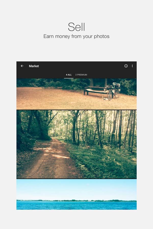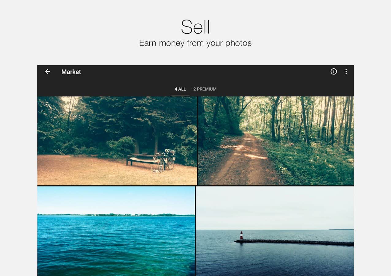 Главной особенностью сервиса является возможность продавать свои снимки на специальной торговой площадке, так что, если вы уверены, что достигли успехов в фотографировании, можете попробовать монетизировать своё хобби.