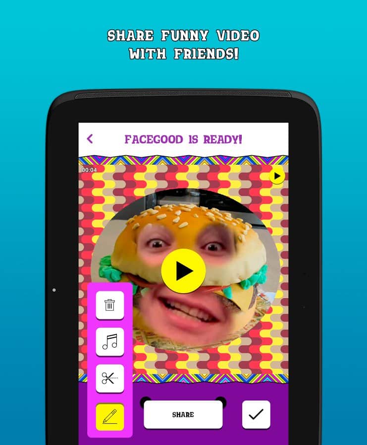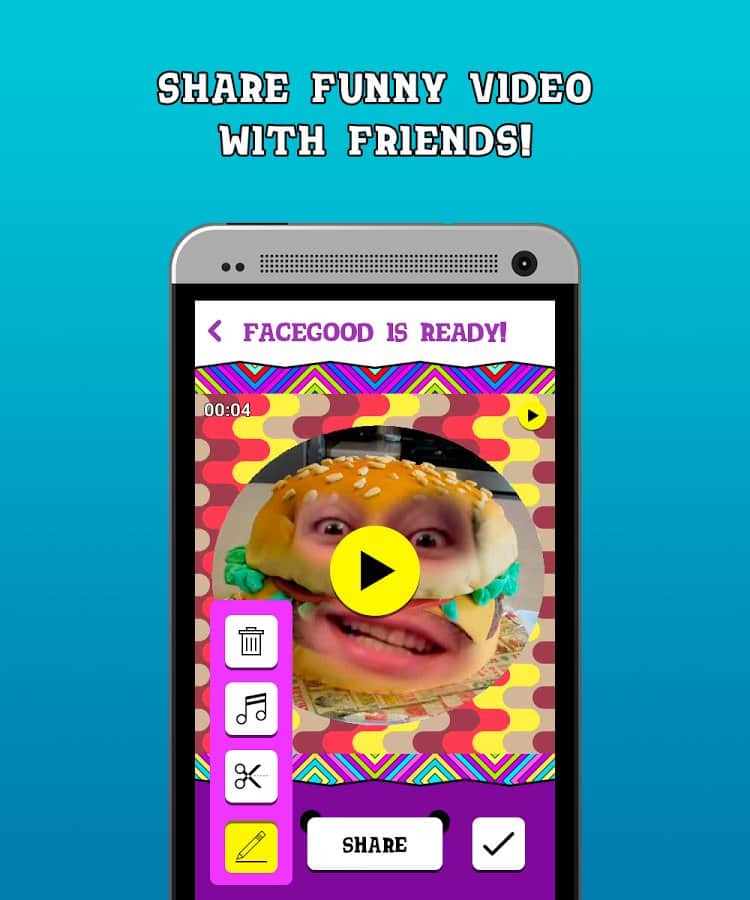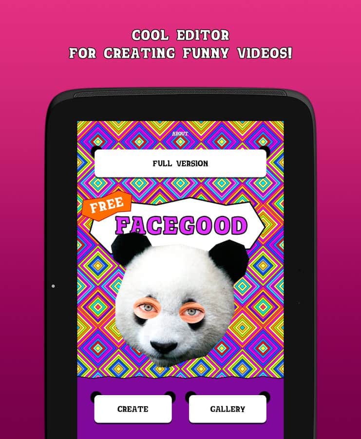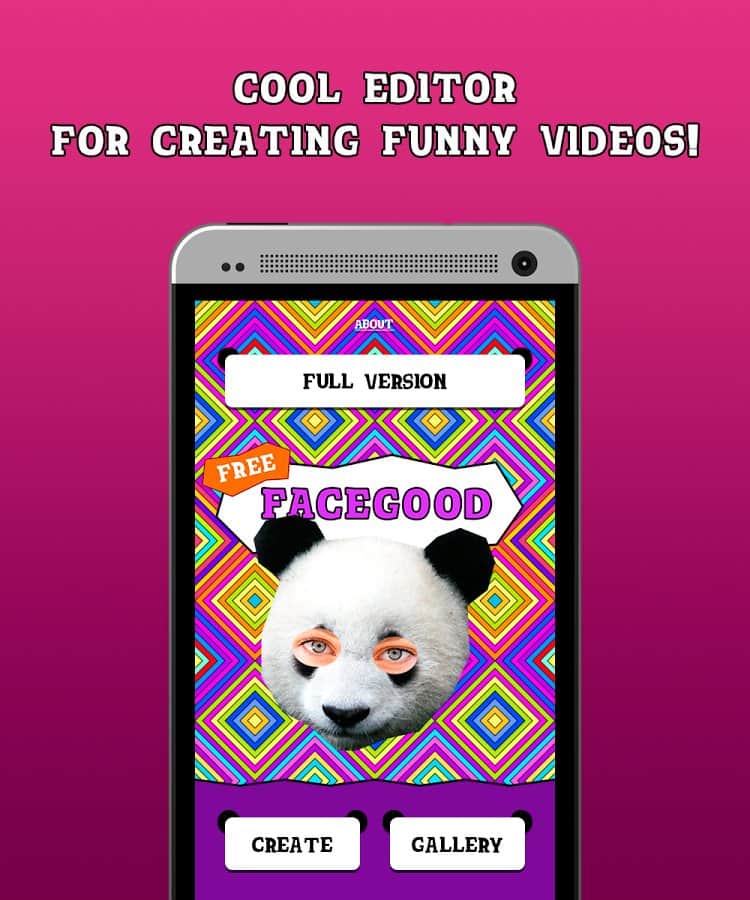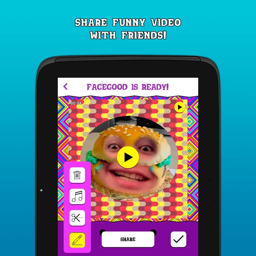 Facegood Free Video Editor – весёлый незатейливый видеоредактор, в котором любую фотографию или картинку можно совместить с видео. Иногда получаются очень смешные и прикольные ролики. Смысл приложения прост, берём любую фотографию, находим интересующее вас видео, вырезаем нужные части, вставляем в фотографию и сохраняем, порой получается очень весело. В компании друзей и на вечеринках приложение заслуженно занимает своё почётное место. Интересное времяпрепровождение вам обеспечено. Своими работами можно поделится в таких известных социальных сетях, как: Vkontakte, Facebook, Twitter или Instagram.