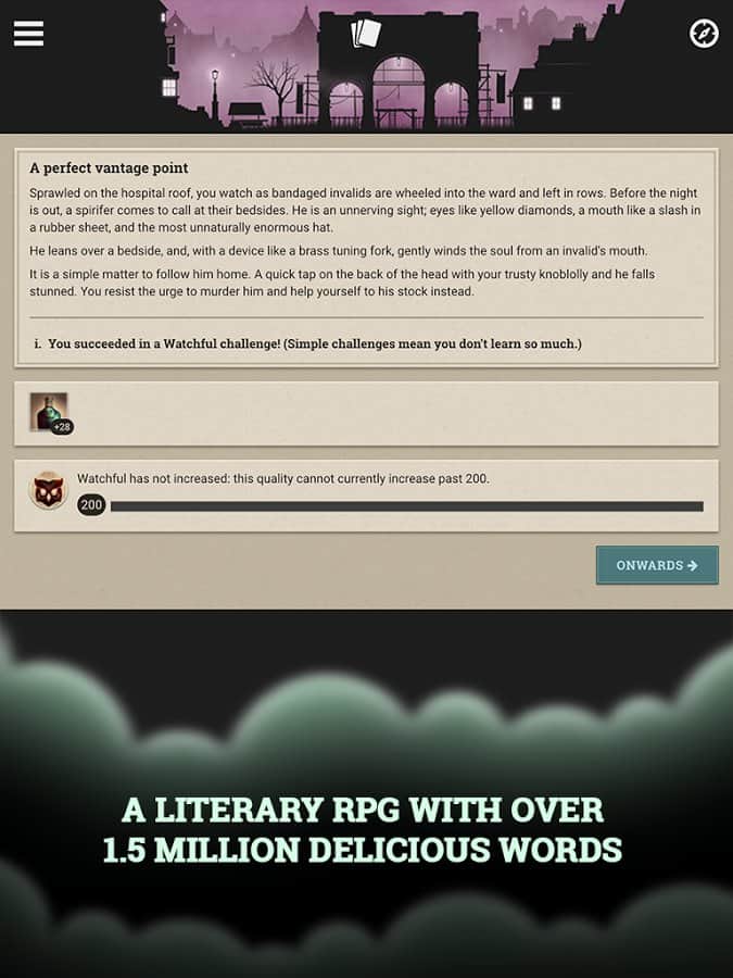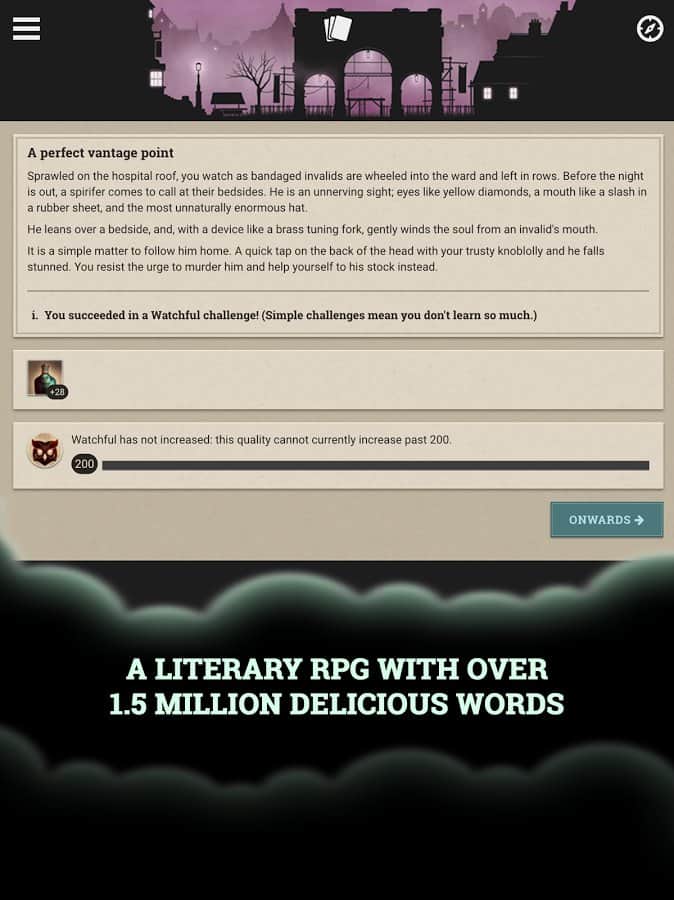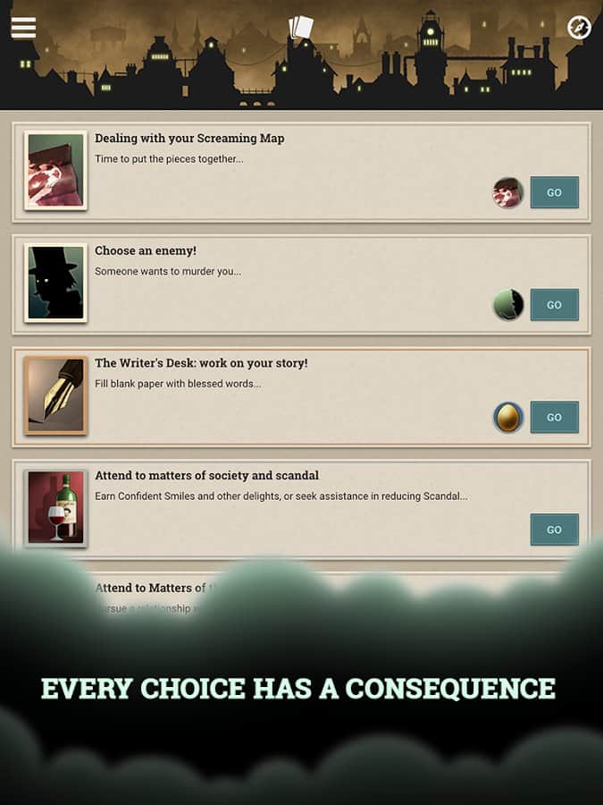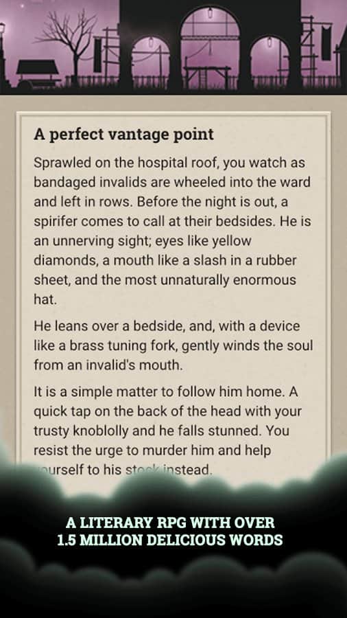 Оригинальная версия игры под названием Fallen London изначально вышла в виде браузерного дополнения и за считанные дни обзавелась завидной аудиторией. В последствии вышла версия для iOS и ПК и вот настал момент для выхода Андроид версии. События игры разворачиваются в "Падшем Лондоне", альтернативном викторианском Лондоне с готическим антуражем. Действие игры начинает развиваться с того момента момента как летучие мыши захватывают власть в городе, вам же предоставляется полная свобода действий, исследуйте мир, выполняйте задания. Сама по себе игровая механика выполнена в стиле классических текстовых квестов с приключенческим сюжетом.