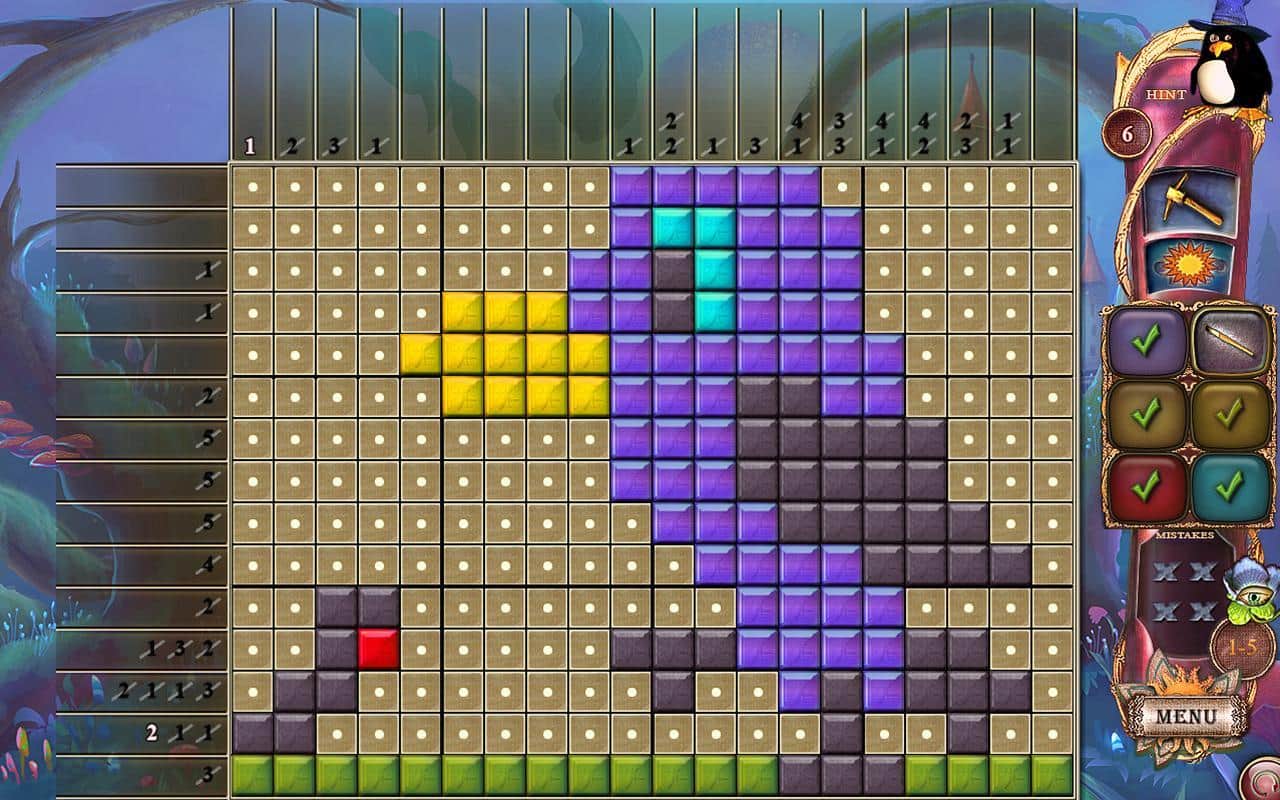 Fantasy Mosaics 26: Fairytale Garden – красочная головоломка-мозаика на андроид, где вы будете помогать пингвинам, раскрашивать красивые картинки. Наши герои пингвины нашли волшебную книгу, гуляя по лесу и теперь им нужна ваша помощь. Исследуйте и раскрашивайте многочисленные и разнообразные картинки из этой книги и наблюдайте за тем, какие картинки в итоге у вас получаться. Раскрашивайте картинки по цифрам в разные места и получайте конечный результат. Эта игра сделана по подобию японских кроссвордов, где вы будете закрашивать клеточки, и получать разные картинки.
