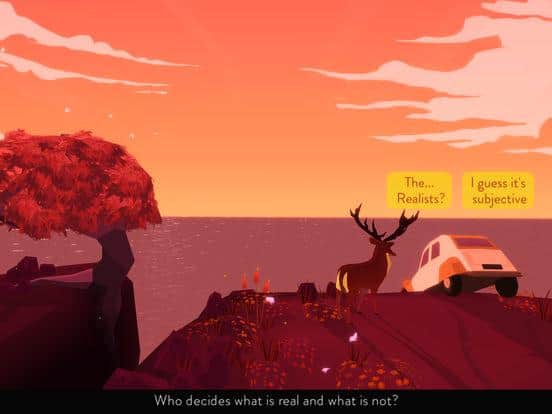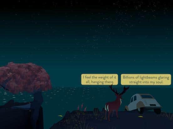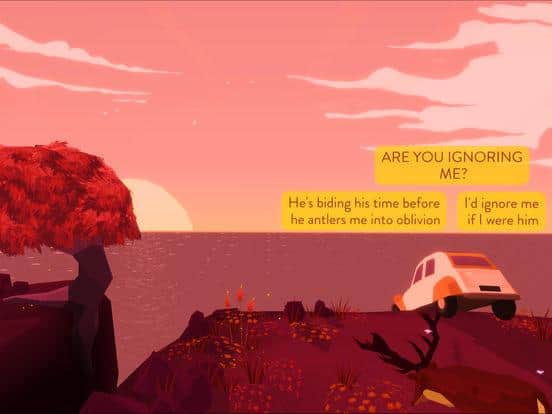 Far from Noise – интерактивная приключенческая игра для IOS, состоящая из одной сцены. В этой игре представлено три действующих лица: первым является девушка, сидящая в автомобиле который весит на краю пропасти, второе олень-философ и третье мать-природа. В этой игре вашей главной задачей будет помогать девушке вести диалоги с оленем до тех пор, пока игра не закончится. Главный смысл игры узнать от оленя захватывающие истории о человеке и выяснить что происходит внутри него. Игра порадует игроков минималистичной графикой, сменой времени суток и захватывающей атмосферной музыкой. Начните свое приключение прямо сейчас и насладитесь неповторимым сюжетом.