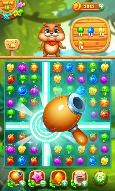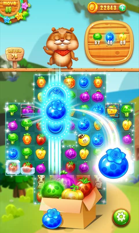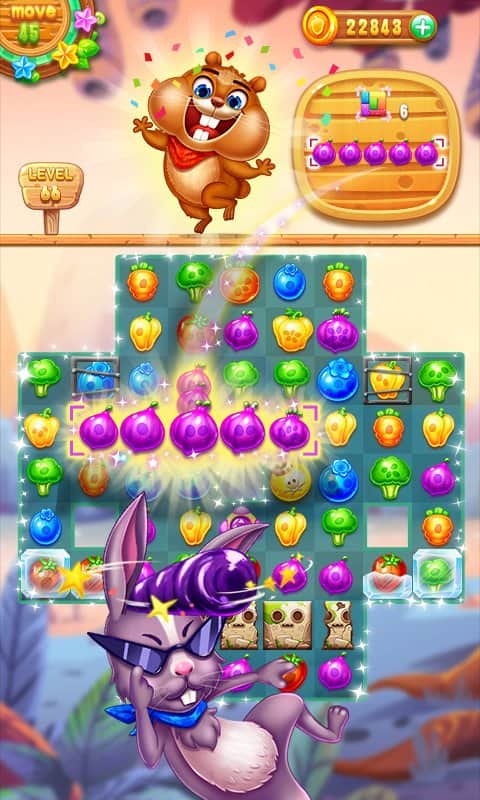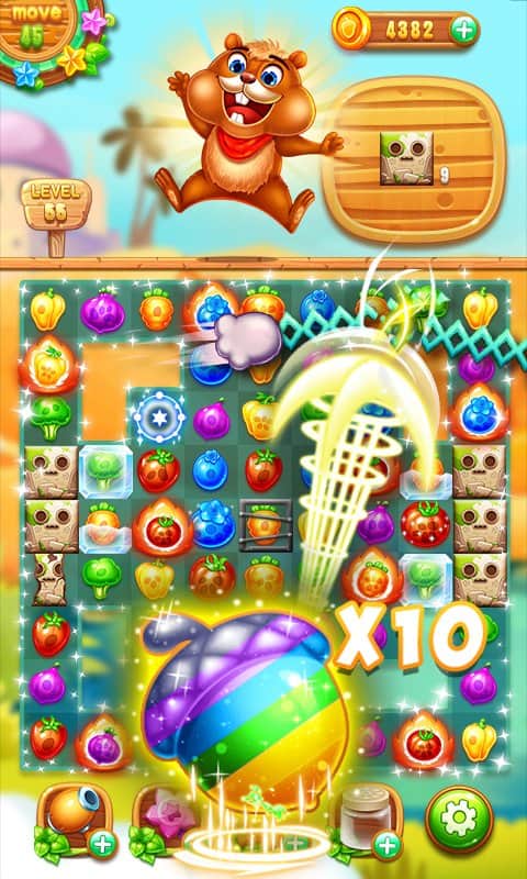 Farm Harvest 2 – веселая игра на андроид, где вы будете помогать белке, собрать как можно больше урожая. Наша трудолюбивая белка готовит запасы на зиму, но ей мешает хитрый кролик, который хочет заполучить себе овощи и фрукты. Составляйте ряды из фруктов и овощей и старайтесь сделать свою работу как можно быстрее чтобы не оставить шанса кролику. Перемещайте по игровому полю объекты и составляйте ряды из трех и более фруктов, а также прибегайте к помощи различных усилений и бонусов, чтобы как можно быстрее пройти уровни. Формируйте максимально длинные ряды и взрывайте их, получая в качестве награды множество очков.