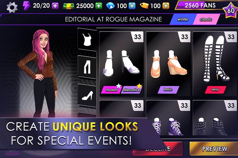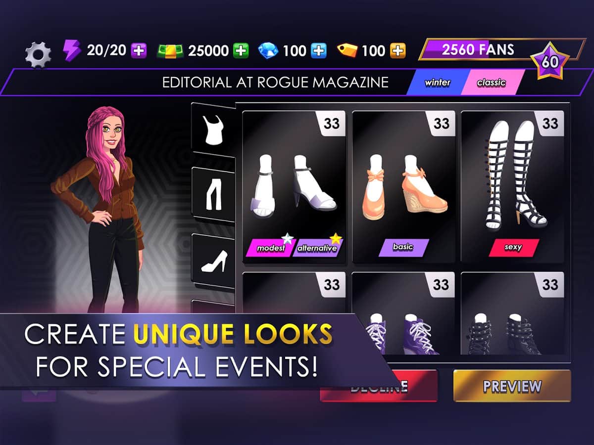 Fashion Fever - Top Model Game – станьте известным стилистом в этой игре на андроид, и покажите на деле свои навыки и отличный вкус. Примеряйте различные образы на моделях, комбинируя между собой различные стили и цвета, создавая неповторимый лук для каждой девушки. Путешествуйте по различным странам и участвуйте в грандиозных показах одежды, преображая своих моделей в зависимости от мероприятия. Посещайте модные показы, вечеринки, телешоу и другие общественные места, чтобы набраться опыта и вдохновиться новыми образами. В вашем арсенале будет огромный выбор одежды, аксессуаров, обуви и сумок, а также вы сможете создать неповторимый внешний вид модели, меняя ее черты лица и прическу. Играйте в мини-игры и выигрывайте новые предметы одежды.