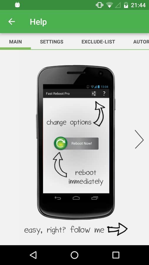 Fast Reboot Pro - Хотите что бы ваш смартфон всегда работал на максимум? Знаете ли вы, что со временем работы, процессы смартфона забиваются, и он в любом случае начинает потреблять больше батареи и памяти. Так вот именно для этого было изобретено данное приложение. Оно выполняет одну очень важную, и очень простую функцию. А именно может перезапускать ваш смартфон, или же приложения которые сейчас работают, впоследствии чего они начинают потреблять меньше памяти.