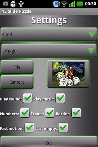 Пятнашки - Всеми любимая игра из прошлого века пришла на андроид платформу. Теперь игра стала еще интересней! Можно выбрать как классический вид пятнашек, так и с иллюстрациями. Так же можно выбрать количество клеток на поле. Главная тема игры – мультфильм Щелкунчик. Именно эти иллюстрации использованы в игре. Так же можно выбрать один из двух тем оформления обычных фишек.