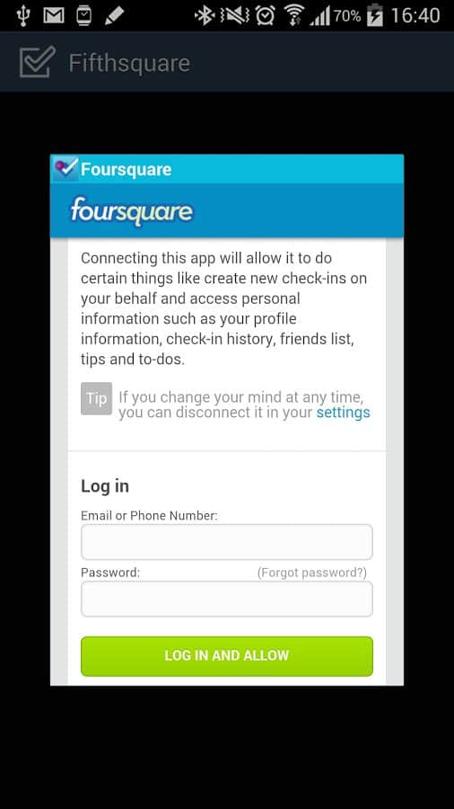 На телефоне откроется окно авторизации Foursquare. Выполните вход (только один раз)