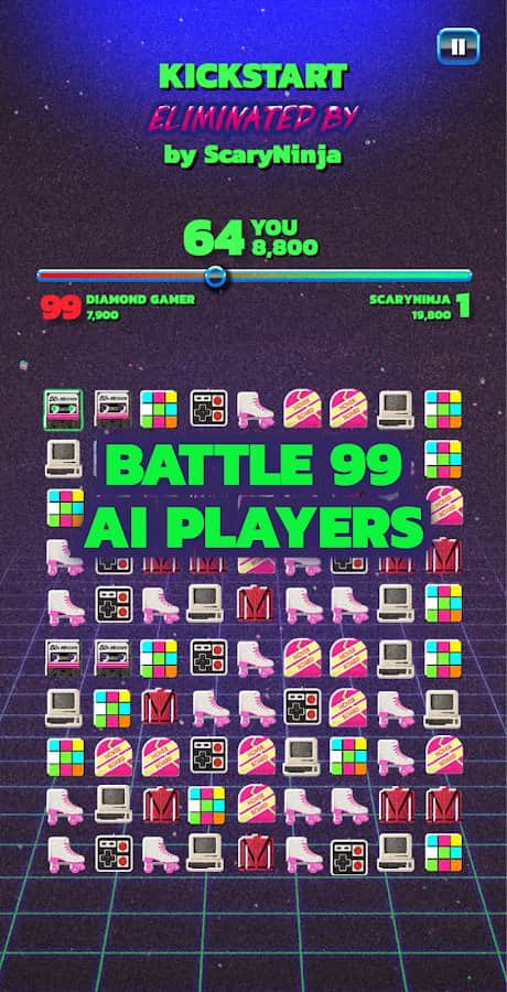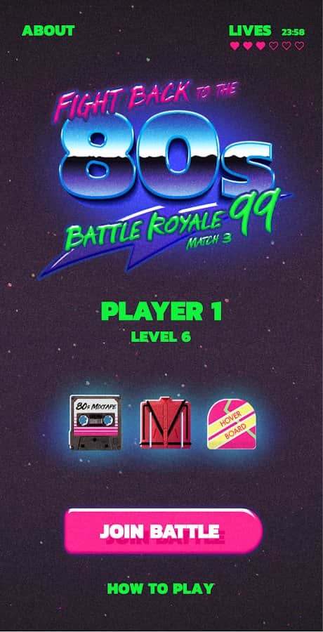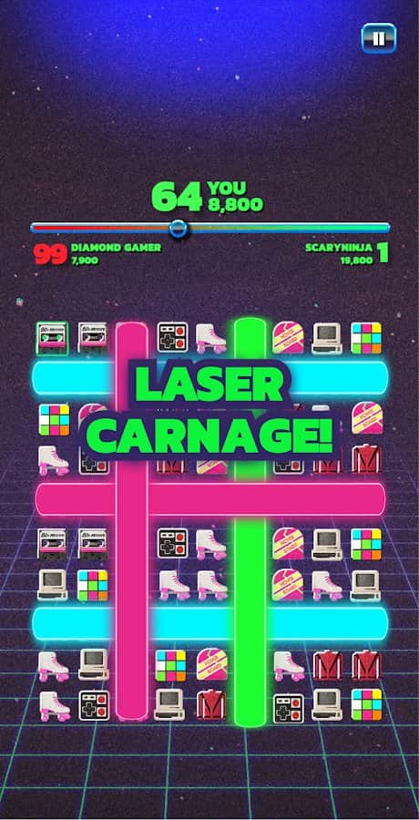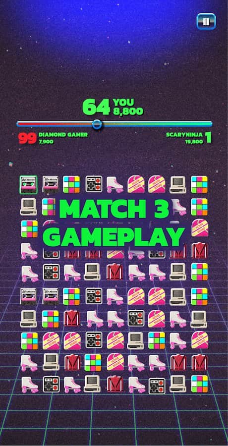 Fight Back to the 80's - Match 3 Battle Royale – увлекательная игра из жанра три в ряд на андроид, где вы окунетесь в эпоху 80-х годов. Эта игра порадует игроков незабываемой и уникальной атмосферой 80-х годов где вы будете составлять ряды из одинаковых объектов и взрывать их очищая игровое поле. Положитесь на свою сообразительность и отличную реакцию и находите нужные вам объекты на поле с многочисленными предметами. Наблюдайте за тем как яркие лазеры будут сжигать объекты и запускайте цепную реакцию взрывов. Игра порадует игроков классической игровой механикой с захватывающим игровым процессом и незабываемым опытом. Открывайте для себя бонусы и бейте рекорды других игроков.